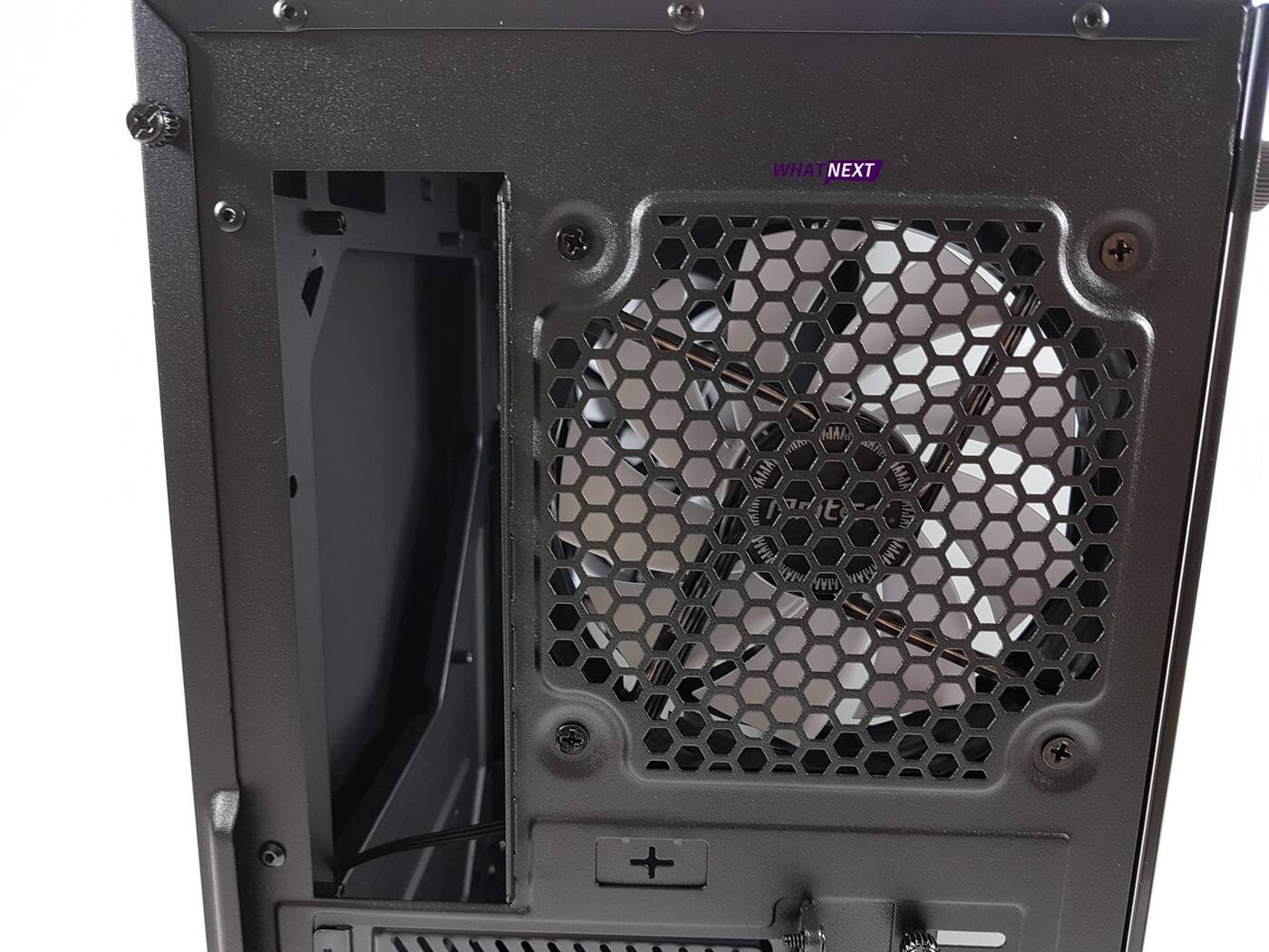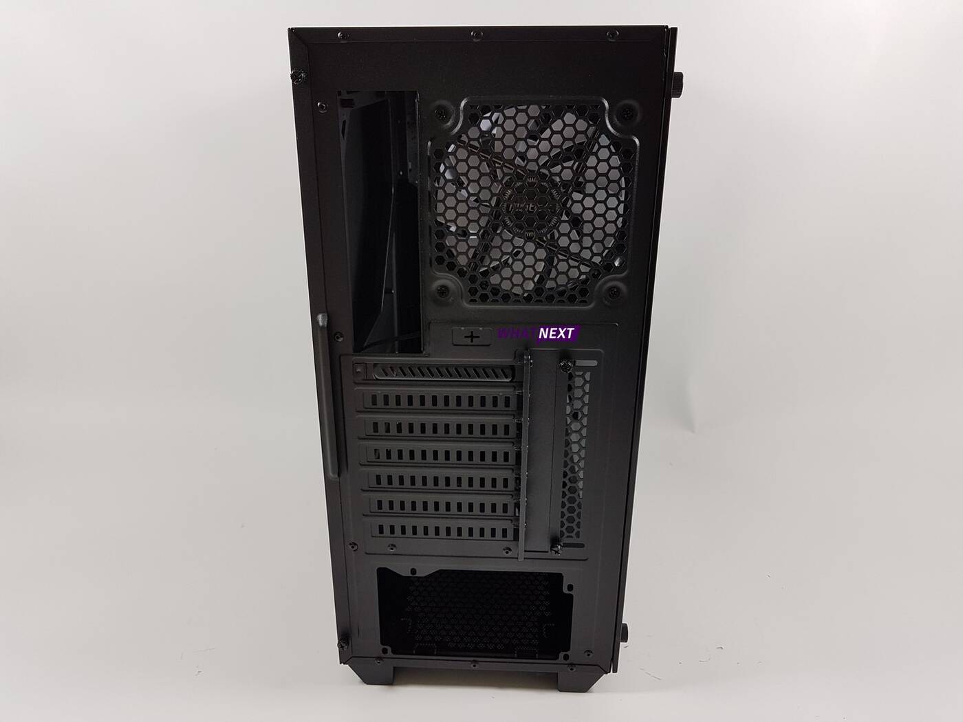 Tył jest dosyć standardowy. Na samym spodzie widoczne jest miejsce na zasilacz. Wyżej jest 7 zaślepek PCI. Tylko jedna z nich jest demontowalna – reszta jest wyłamywanych. W obudowie za ceną ok. 300 zł jest to niedopuszczalne. Nad nimi znajduje się 120 mm wentylator, dokładnie ten sam model co przednie śmigła.