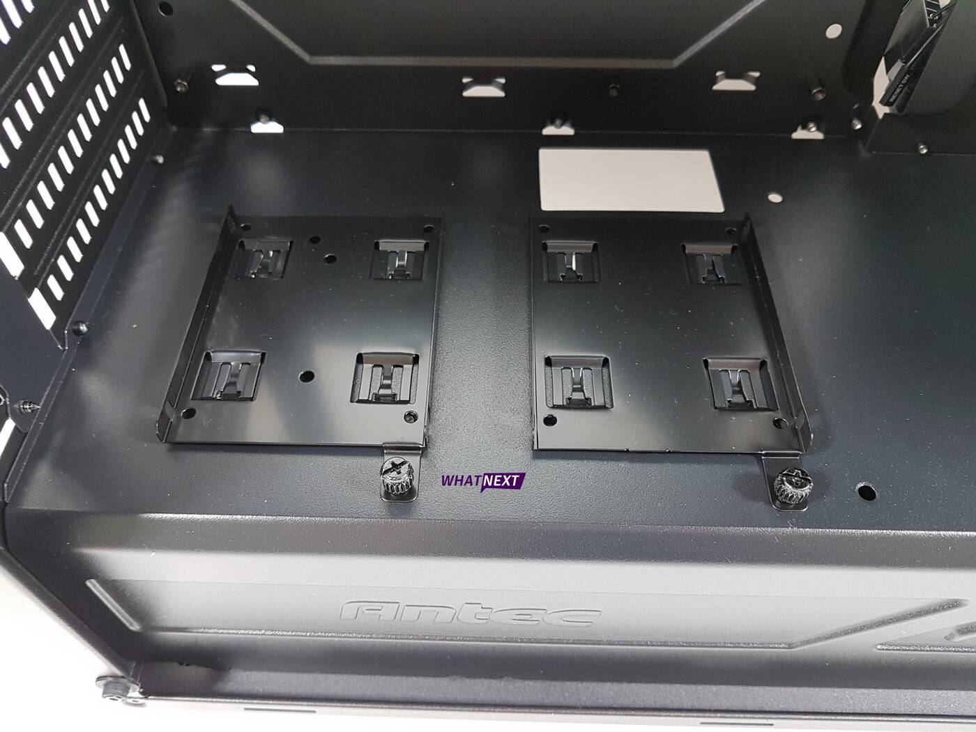 P8 stoi na czterech nóżkach, które zostały wyłożone od spodu antypoślizgowym materiałem. Dzięki niemu obudowa nie ślizga się po panelach. Pod miejscem na zasilacz znajduje się filtr przeciwkurzowy, który jest dosyć ciężki do obsługi – jego montaż powinien być prostszy. Dalej widać cztery szybkośrubki, które umożliwiają wyjęcia koszyka na dyski 3,5 cala.