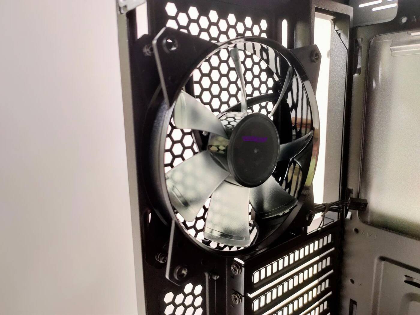 Tył jest standardowy. Na samym dole jest miejsce na zasilacz, wyżej 7 mocowanych na śruby zaślepek PCI a na samej górze jest jedyny 120 mm wentylator. Jego maksymalna prędkość to 1200 RPM i zasilany jest on ze złącza 3 pin.