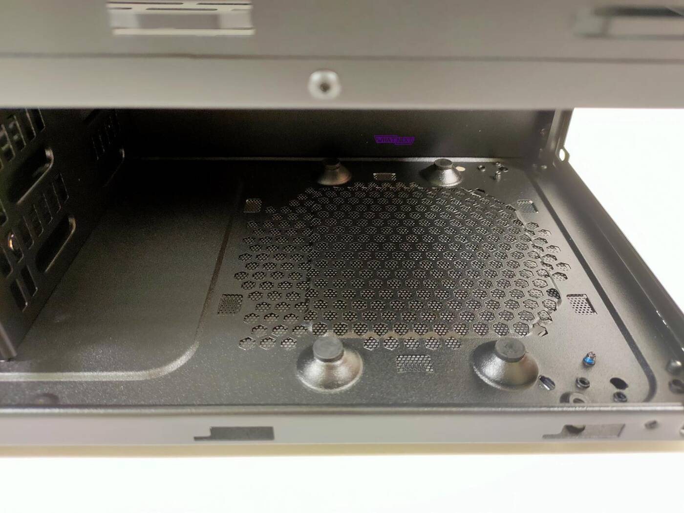 Cooler Master MasterBox MS600 stoi na czterech nóżkach. Obudowa nie ślizga się po panelach. pod zasilaczem widać filtr przeciwkurzowy, jednakże jego wyjęcie i wyczyszczenie przy stojącej obudowie będzie dosyć ciężkie.