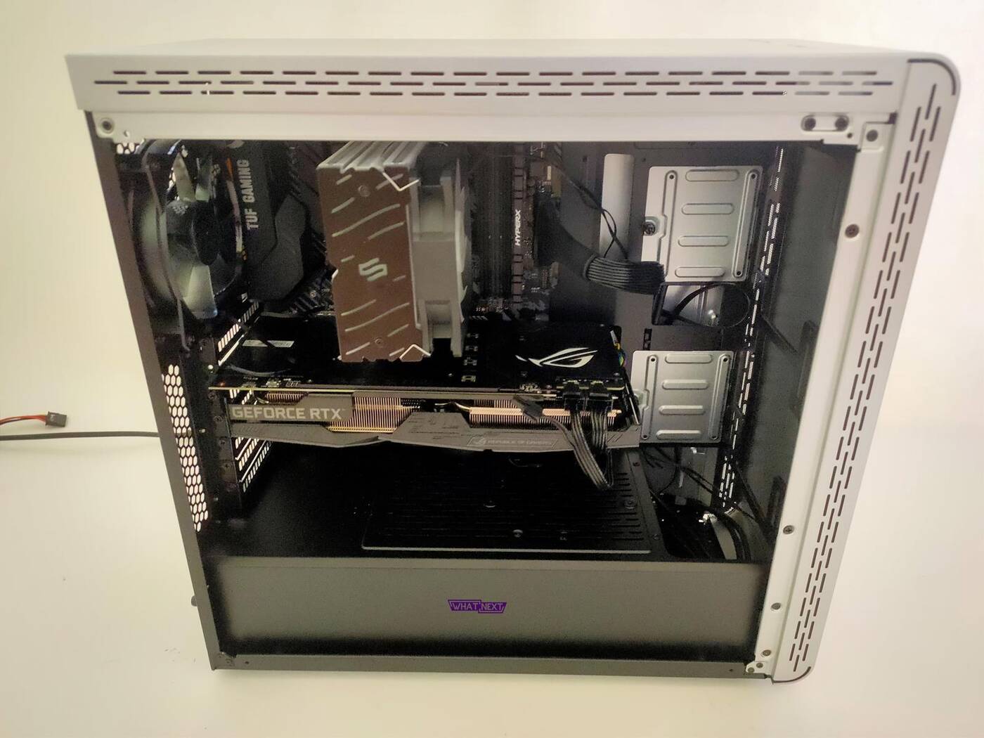 Przedni panel tworzy z górnym jedną całość. To właśnie takie rozwiązanie wyróżnia obudowę wśród konkurencji. Panel jest wykonany z tworzywa sztucznego i po bokach są otwory wentylacyjne. Z racji, iż cały jest zabudowany nie spodziewamy się dobrego przepływu powietrza.