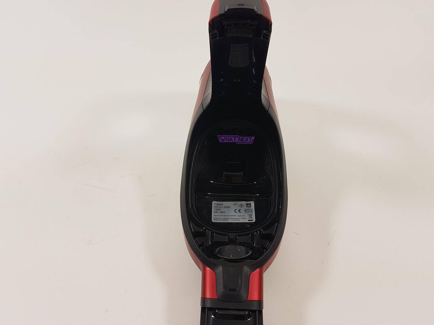 SpeedPro Max składa się z trzech części – silnika z pojemnikiem na kurz, rury oraz szczotki. Zacznijmy od tego pierwszego. Odkurzacz posiada rączką, na której w wygodnym miejscu znajduje się przycisk do przełączania trybu pracy. Są trzy opcje do wyboru – Eco, Normalny i Turbo. Produkt Philipsa posiada akumulator litowo-jonowy 25,2 V, który ma zapewniać czas pracy kolejno 65 minut, 30 minut i 22 minuty. Czas ładowania to 5 godzin a maksymalna głośność podczas pracy to 84 dBA. Nad przełącznikiem znajduje się wyświetlacz pokazujący procentowo pojemność akumulatora. Natomiast nie pokazuje on dokładnie pojemności, ale odbywa się to z krokiem co 10%. SpeedPro Max posiada cyfrowy silnik PowerBlade, który zapewnia przepływ powietrza ponad 1000 l/min. Także został on wyposażony w technologię PowerCyclone 8, która umożliwia wyeliminowanie worka z odkurzacza. Kolejna rzecz to 2-warstwowy antyalergiczny filtr z potrójną filtracją, który sprawia, że do silnika trafia wyłącznie czyste powietrze, co zapewnia utrzymanie wysokiego przepływu powietrza, a także wyłapuje ono do 99% drobnych cząsteczek kurzu i alergenów. Pojemnik na kurz jest w stanie pomieścić 0,6 l, co powinno starczyć na wiele sprzątań. Jest on także bardzo łatwy do zdemontowania i wyczyszczenia. Tę część można używać jako odkurzacza ręcznego bądź pominąć rurę i doczepić do niego od razu szczoteczkę.