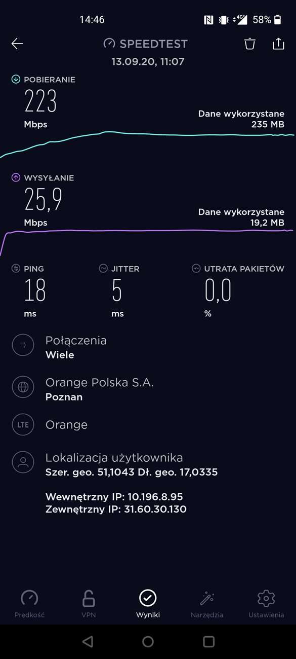Działało za to LTE – i to wyśmienicie. W aplikacji Speedtest w sieci Orange we Wrocławiu prędkość pobierania danych wyniosła 223 Mb/s, a wysyłania – 25,9 Mb/s. To świetne rezultaty, które potwierdzają, że z prędkości internetu powinniśmy być zadowoleni, niezależnie czy jesteśmy z zasięgu 5G, czy „tylko” LTE.