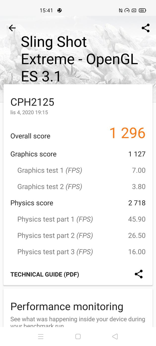 - 3D Mark (test Sling Shot Extreme) – 1296 pkt (OpenGL ES 3.1)