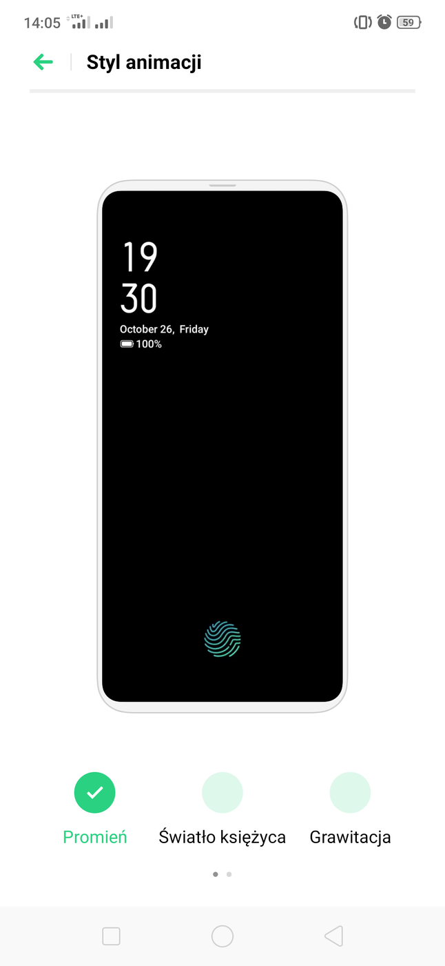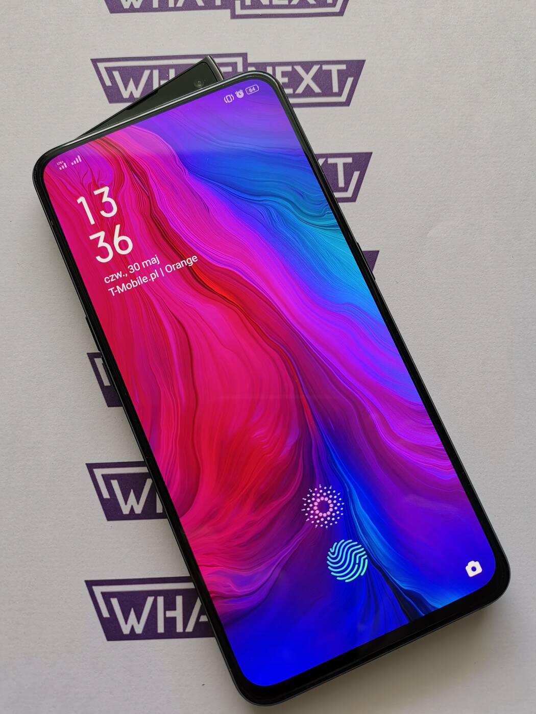 OPPO po raz kolejny postawił na zaimplementowany czytnik linii papilarnych w ekranie. Pomimo że umiejscowienia czytnika jest mocno wyeksponowane przyjemną grafiką (którą notabene możemy dowolnie zmieniać), to nadal jego użycie wymaga większej powierzchni nacisku oraz precyzji. Przy idealnym przyłożeniu palca odblokowanie urządzenia trwa zaledwie ułamki sekund, problem leży w jego perfekcyjnym ułożeniu, co niestety zdarza się stosunkowo rzadko. Nie napisze niczego odkrywczego, że w porównaniu do tego typu czytników dużo lepiej sprawdza się klasyczne odblokowanie za pomocą skanu twarzy, szczególnie że w tym przypadku wiąże się to z efektownym uruchomieniem mechanizmu wysunięcia górnej platformy.