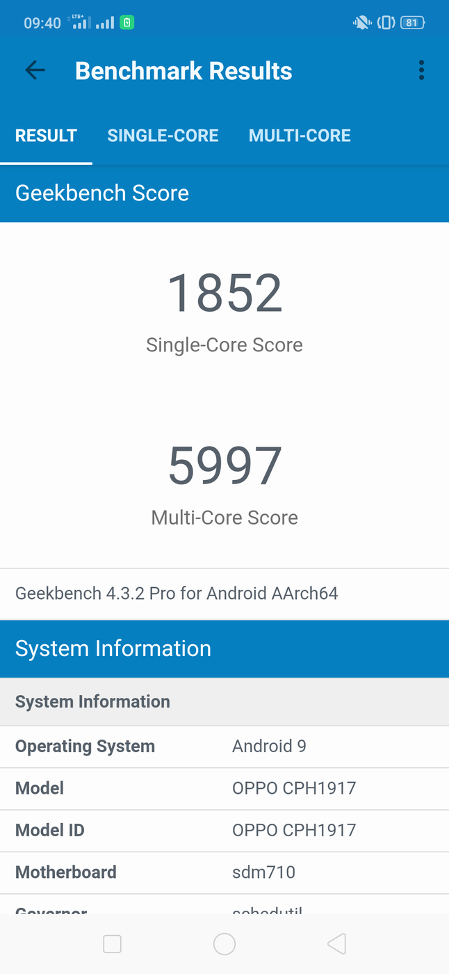 Pod względem podzespołów OPPO zadbało o przyzwoity standard. Ośmiordzeniowy procesor Qualcomm Snapdragon 710 w połączeniu z 6 GB pamięci operacyjnej (RAM) gwarantuje wysoką kulturę pracy, jak i możliwość cieszenia się z dostatecznych detali przy bardziej wymagającej rozgrywce mobilnej. Potwierdzają to stosunkowo wysokie wyniki testów syntetycznych: