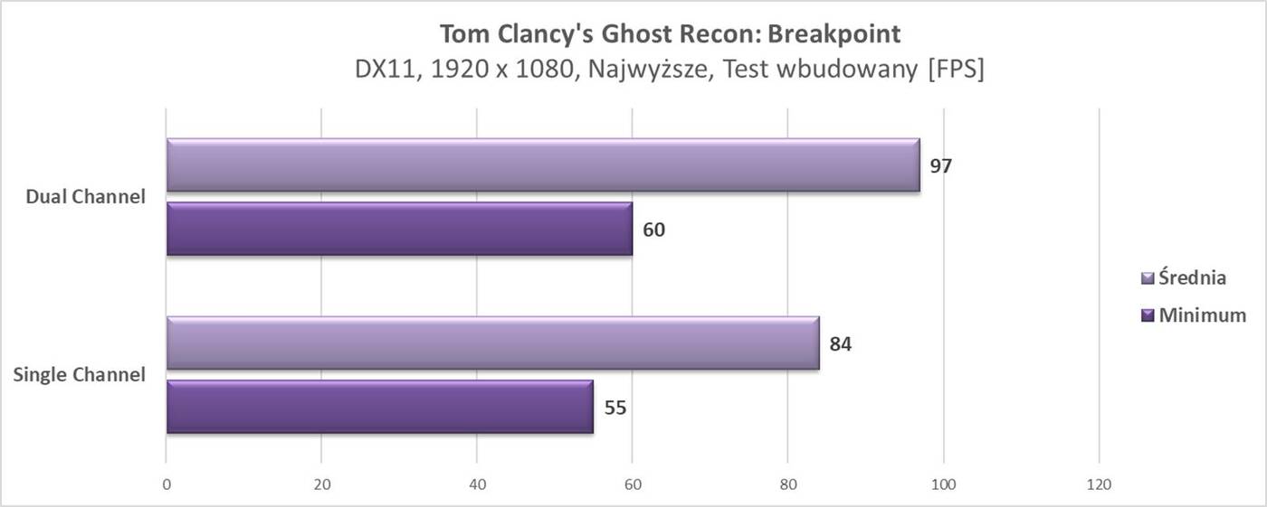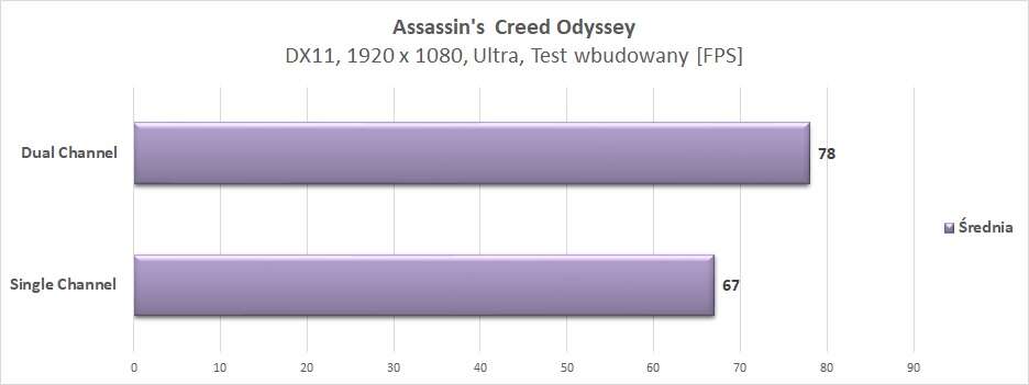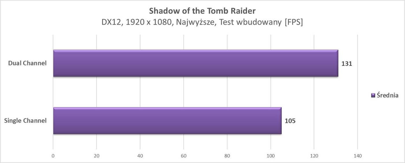W przypadki takich tytułów jak Far Cry New Dawn, Assassin’s Creed Odyssey, Battlefield V czy Shadow of the Tomb Raider DX12 różnica jest naprawdę ogromna. Potrafi ona sięgać nawet 30%, co jest już mocno odczuwalne i tutaj posiadanie pamięci w konfiguracji Dual Channel w zasadzie jest obowiązkowe. W szczególności zrobi to różnicę przy bardzo mocnym sprzęcie i monitorze 144 Hz lub nawet szybszym. Wtedy ta różnica w fps może wpływać na jakość wyświetlanej rozgrywki i ułatwi Wam uzyskanie 144 fps w danym tytule.