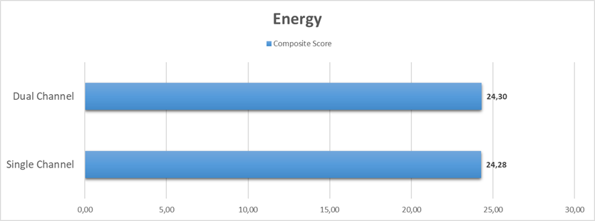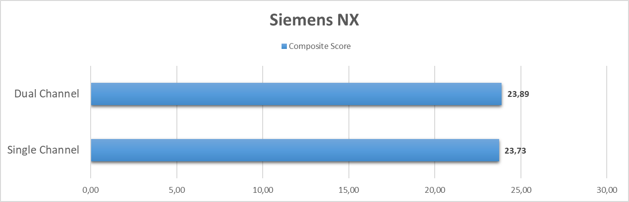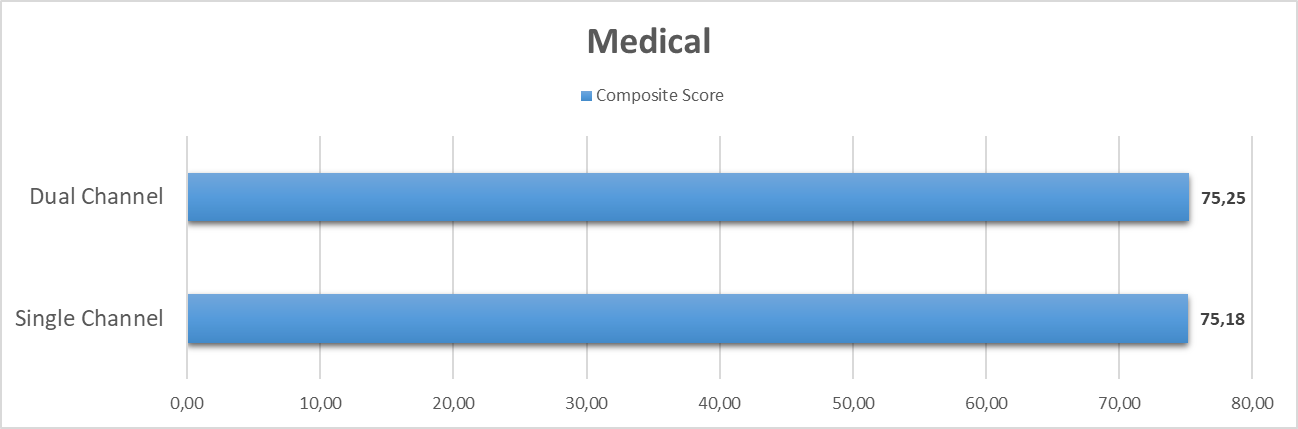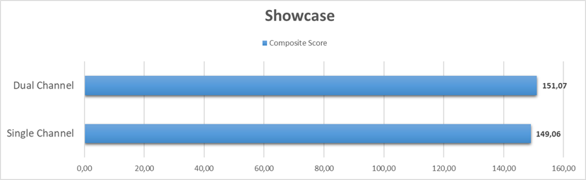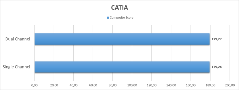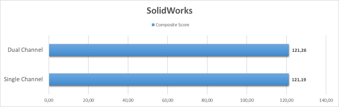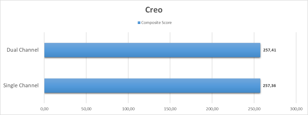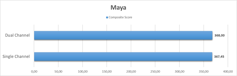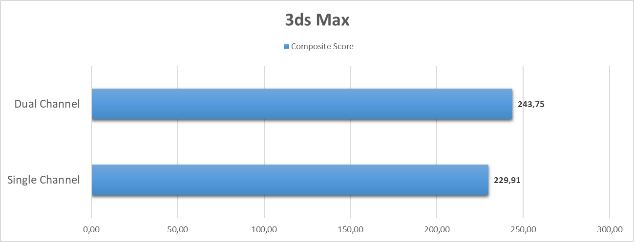 W przypadku testów w SpecViewperf 13 największa różnica była widoczna w 3DS Max – 6%. Jedynie jeszcze w Showcase wynosiła ona 1,35%. W pozostałych programach wyniki praktycznie się pokrywają i nie ma znaczenia, czy jest Single Channel czy Dual Channel.