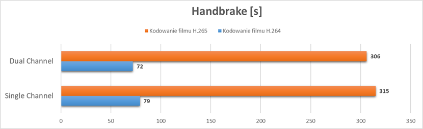 Przy kodowaniu filmu H.264 odnotowałem największą różnicę w testach – ok. 9,7%. Może to już być istotne przy znacznie większych filmach. W przypadku H.265 również są różnice, ale wynoszą one ok. 3%. W tego typu zastosowaniach warto też mieć włączony tryb Dual Channel.