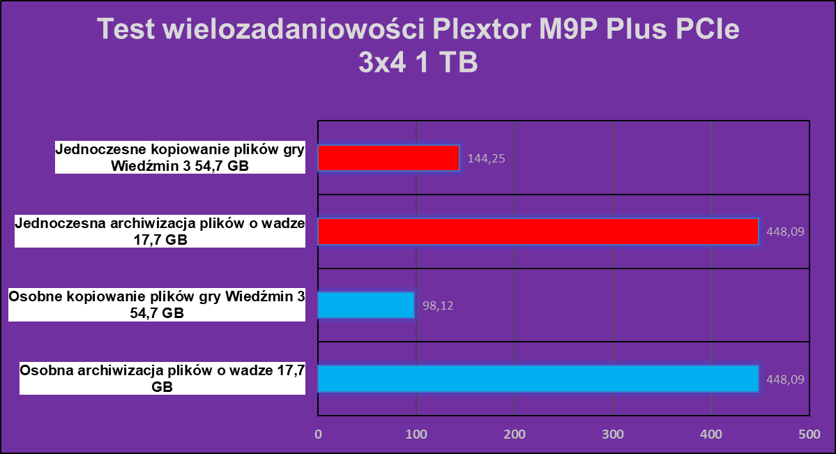 Plextor M9P Plus jako jeden z nielicznych dysków poradził sobie z łączonym zadaniem archiwizacji i kopiowania w tym samym czasie, w którym radził sobie przy osobnej archiwizacji. Zaoszczędził tym samym całe 98 sekund na dwóch operacjach, choć wydłużył samo kopiowanie plików Wiedźmina.