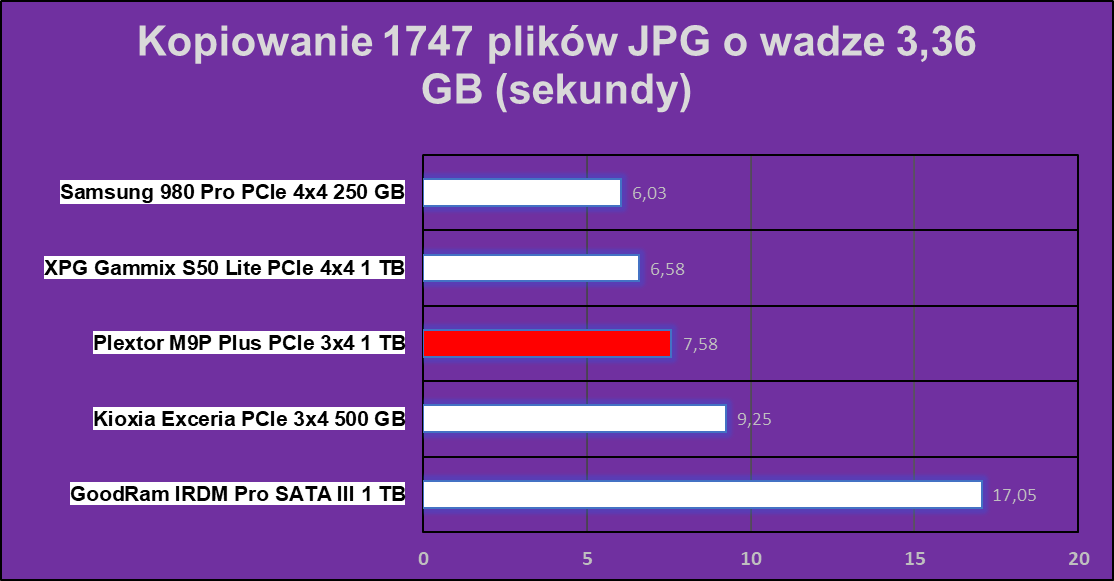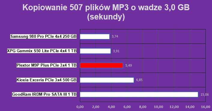 Plextor M9P Plus zgodnie z oczekiwaniami w przypadku operacji na plikach, ląduje na drugim i trzecim miejscu, pokonując czasem nawet z pozoru wydajniejsze nośniki.