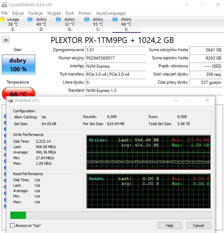 Razem ze swoim radiatorem Plextor M9P Plus może pracować w temperaturze 0℃ ~70℃, gdzie te 70 stopni oznacza już moment, w którym powinien obniżać swoją wydajność na rzecz próby ochłodzenia się. W przypadku tego dysku thermal-throttling jest jednak nie do wygenerowania, a najwyższa temperatura wyniosła u mnie 66 stopni Celsjusza.
