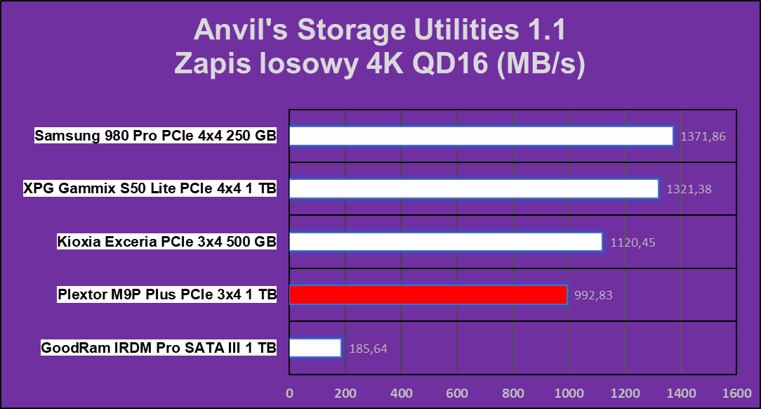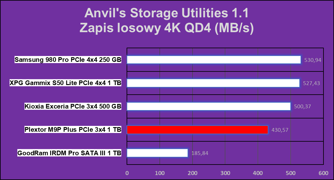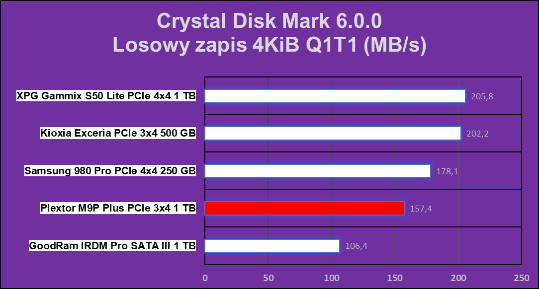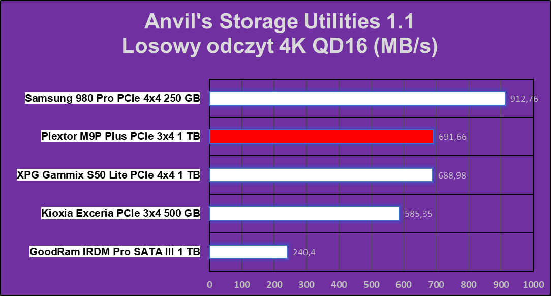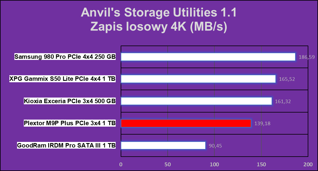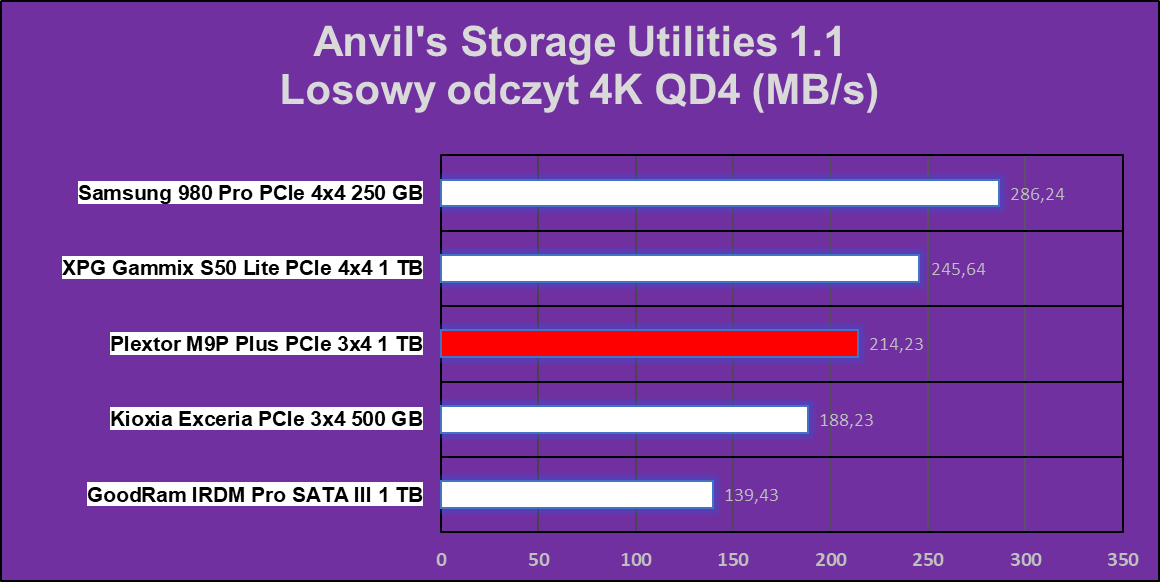 Plextor M9P Plus stawia tutaj w szranki z dwoma dyskami na PCIe 4.0 oraz dyskiem Kioxia wykorzystującym tę samą konfigurację interfejsu, co on sam, ale o dwukrotnie niższej pojemności. Podczas gdy testowany dysk ustępował tylko lepszej parze w kwestii odczytu, nośnik Kioxia przewyższał go zwykle w operacjach losowych.