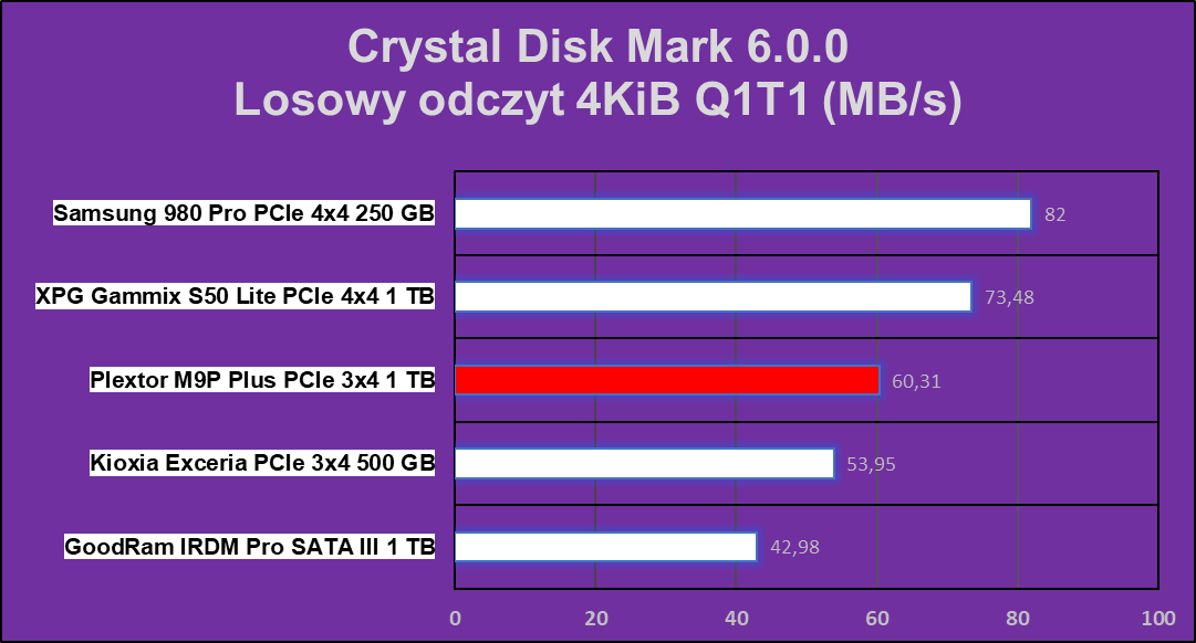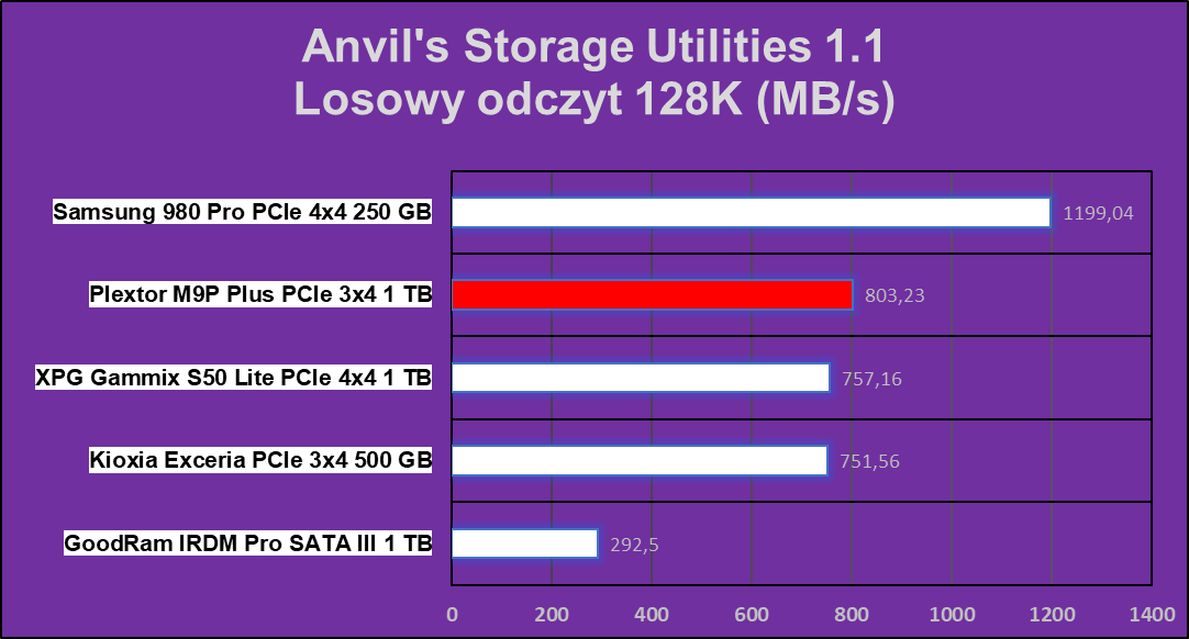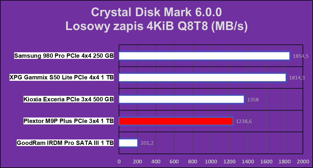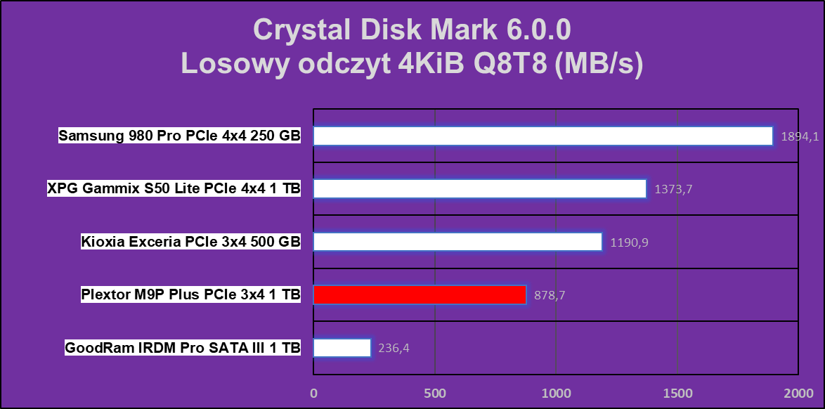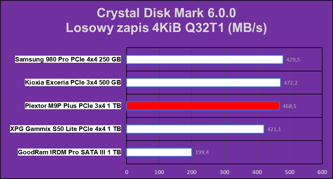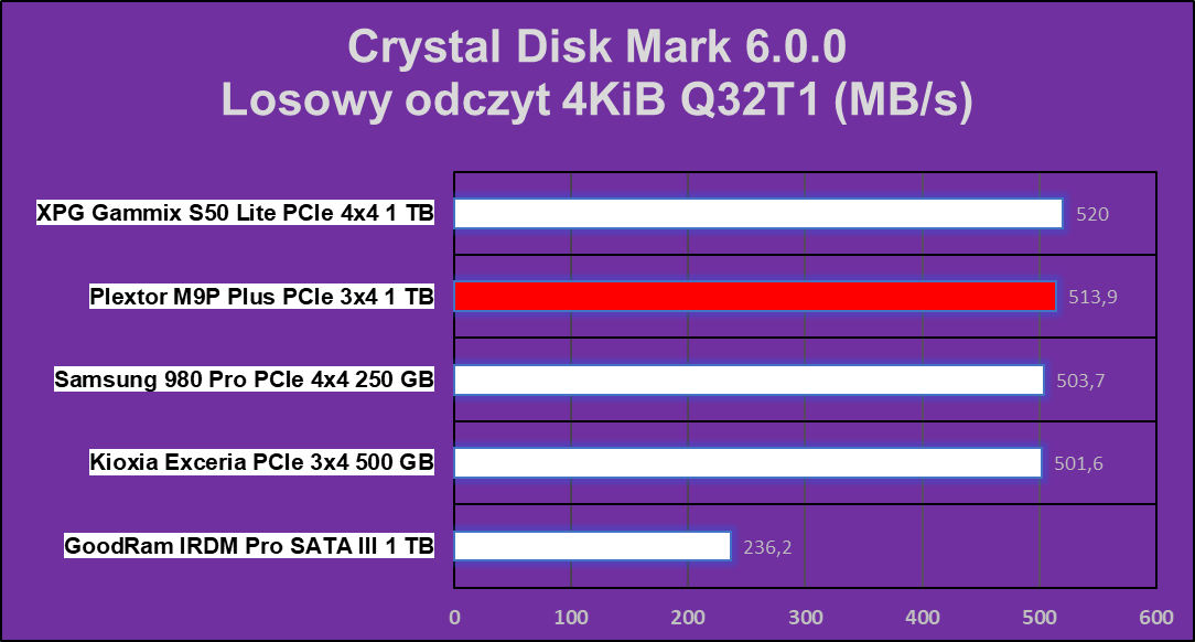 Plextor M9P Plus stawia tutaj w szranki z dwoma dyskami na PCIe 4.0 oraz dyskiem Kioxia wykorzystującym tę samą konfigurację interfejsu, co on sam, ale o dwukrotnie niższej pojemności. Podczas gdy testowany dysk ustępował tylko lepszej parze w kwestii odczytu, nośnik Kioxia przewyższał go zwykle w operacjach losowych.