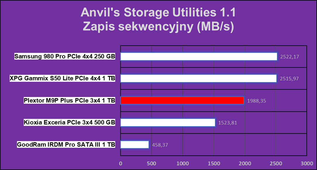 Obiecany przez producenta sekwencyjny odczyt Plextor M9P Plus został zapewniony z nawiązką, a zapisowi niewiele brakowało do osiągnięcia 2200 MB/s.