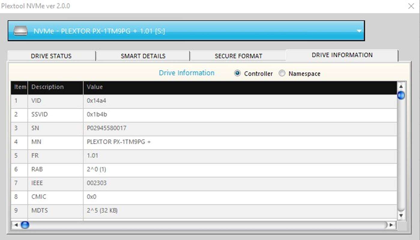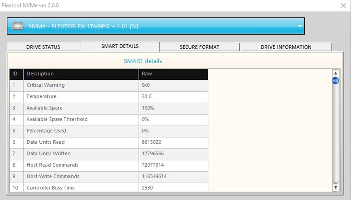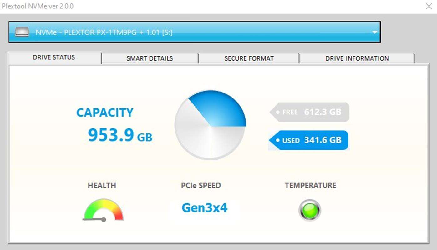 Plextor dla swojego dysku zapewnia proste oprogramowanie Plextool o interfejsie rodem sprzed dekady. W tej aplikacji podejrzymy stan pojemności dysku, jego zdrowie, temperaturę na zasadzie koloru, szczegóły SMART, ale też przeprowadzimy bezpieczny format i wczytamy się w informacje na jego temat.