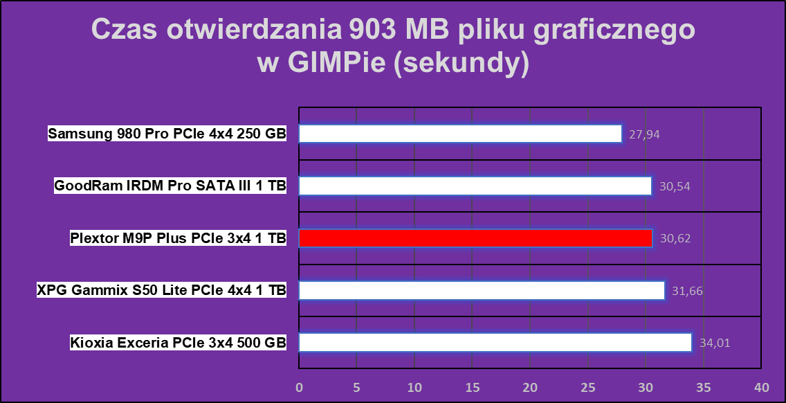 Wydajność w programach nie jest dla Plextor M9P Plus najlepszą stroną, jako że plasuje się głównie wyżej tylko od dysku SATA, ale znów różnice nie są czasem aż tak wysokie.