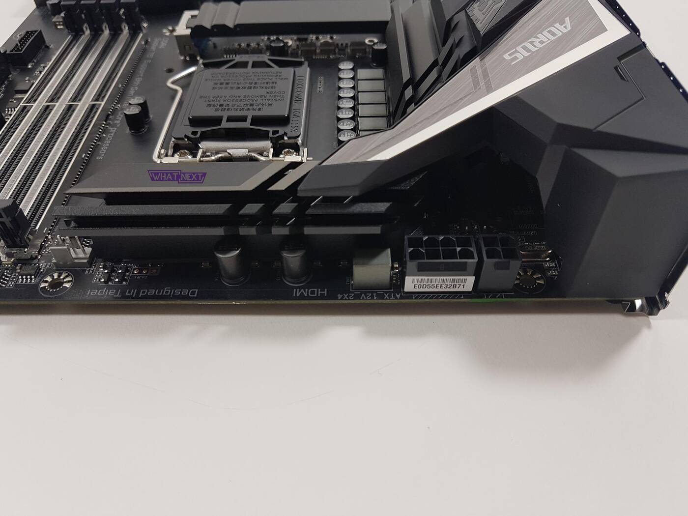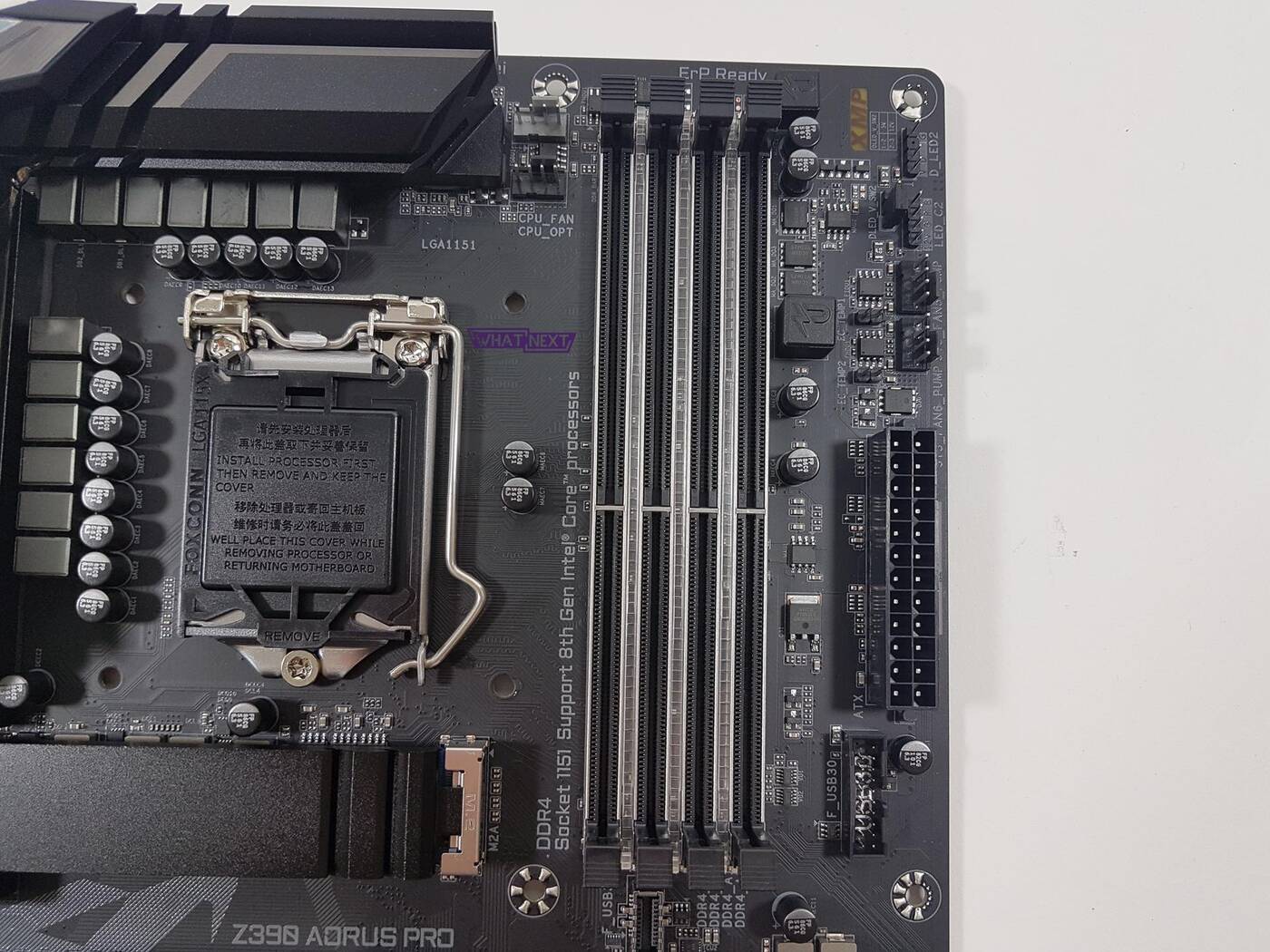 Po prawej stronie znajdują się cztery gniazda DDR4. Obsługują one pamięci o pojemności do 64 GB i częstotliwości do 4133 MHz. Oczywiście wspiera ona także ustawienia XMP, które umożliwiają osiągnięcie takich prędkości. Aorus Z390 Pro posiada trzy złacza PCI-E, z czego działają one kolejno jako x16, x8 i x4. Oprócz tego ma ona także trzy złącza PCI-E x1. Dwa górne złącza PCI-E i złącza pamięci RAM są specjalnie wzmacniane. Nie są więc im straszne nawet bardzo ciężkie podzespoły. Płyta wspiera także Nvidia Quad-GPU SLI, 2-Way SLI, QUad-GPU Crossfire i 3-Way/2-Way Crossfire.
