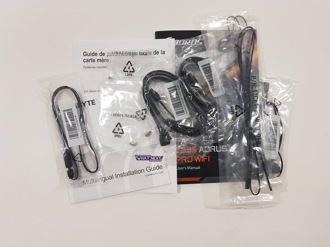 Płyta została zapakowana w standardowe pudełko dla Aorusa. W środku znajdziemy instrukcję, mnóstwo dodatkowych karteczek, płytę ze sterownikami, cztery kable Sata, czujniki temperatury oraz kabel RGB. Dodatki są więc bogate i od razu widać, że jest to płyta z wyższej półki.