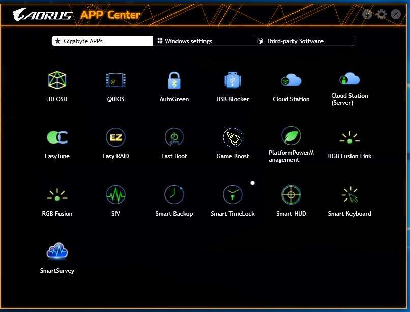 Aorus dodaje do płyty oprogramowanie App Center. Oferuje ono sporo możliwości konfiguracji. Jedną z ważniejszych opcji jest możliwość sterowania podświetleniem (jak widzicie oprogramowanie poprawnie wykryło także grafikę), wentylatorami czy łatwą aktualizację BIOSu. Wszystko jest proste, przejrzyste i łatwe do ogarnięcia.