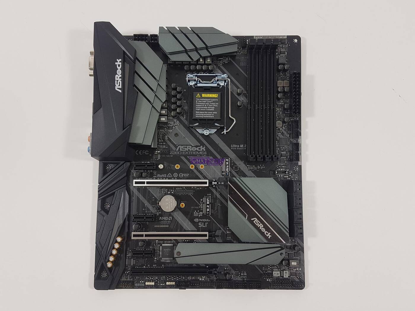 Płyta wygląda całkiem fajnie. Posiada ono podświetlenie, którym można sterować za pomocą oprogramowania. Jest ono szaro-czarna i powinna pasować do zestawów komputerowych tworzonych w tej kolorystyce. Z390 Extreme4 jest w formacie ATX i ma wymiary wynoszące 305 mm x 244 mm. Gniazdo procesora obsługuje konstrukcje z 8. i z 9. generacji Intela. Za zasilanie odpowiada 12 fazowa sekcja zasilania. Jej chłodzenie jest bardzo dobre i nie będzie problemów z przegrzewaniem się. Procesor zasilany jest z jednej wtyczki 8 pin i jednej 4 pin.