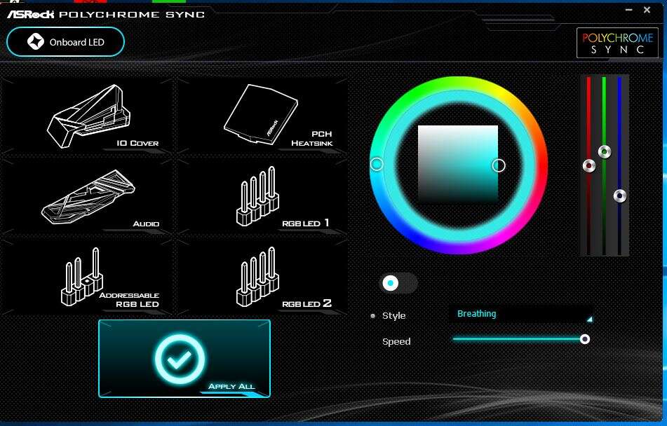 Z oprogramowania warto wspomnieć o dwóch aplikacjach. Pierwsza to A-Tuning. Pozwala ona na zmianę trybu pracy komputera, podkręcanie procesora czy sterowanie wentylatorami. Także wyświetla ono wszelkie informacje na temat sprzętu. Drugie to Polychrome Sync, które umożliwia zmianę podświetlenia. Sterować można z osobna każdą rzeczą oraz dołączonymi paskami czy urządzeniami LED. Oprogramowanie jest jasne i bardzo proste w użytkowaniu. Można zmieniać style podświetlenia oraz sprawić, aby każda rzecz inaczej wyglądała.