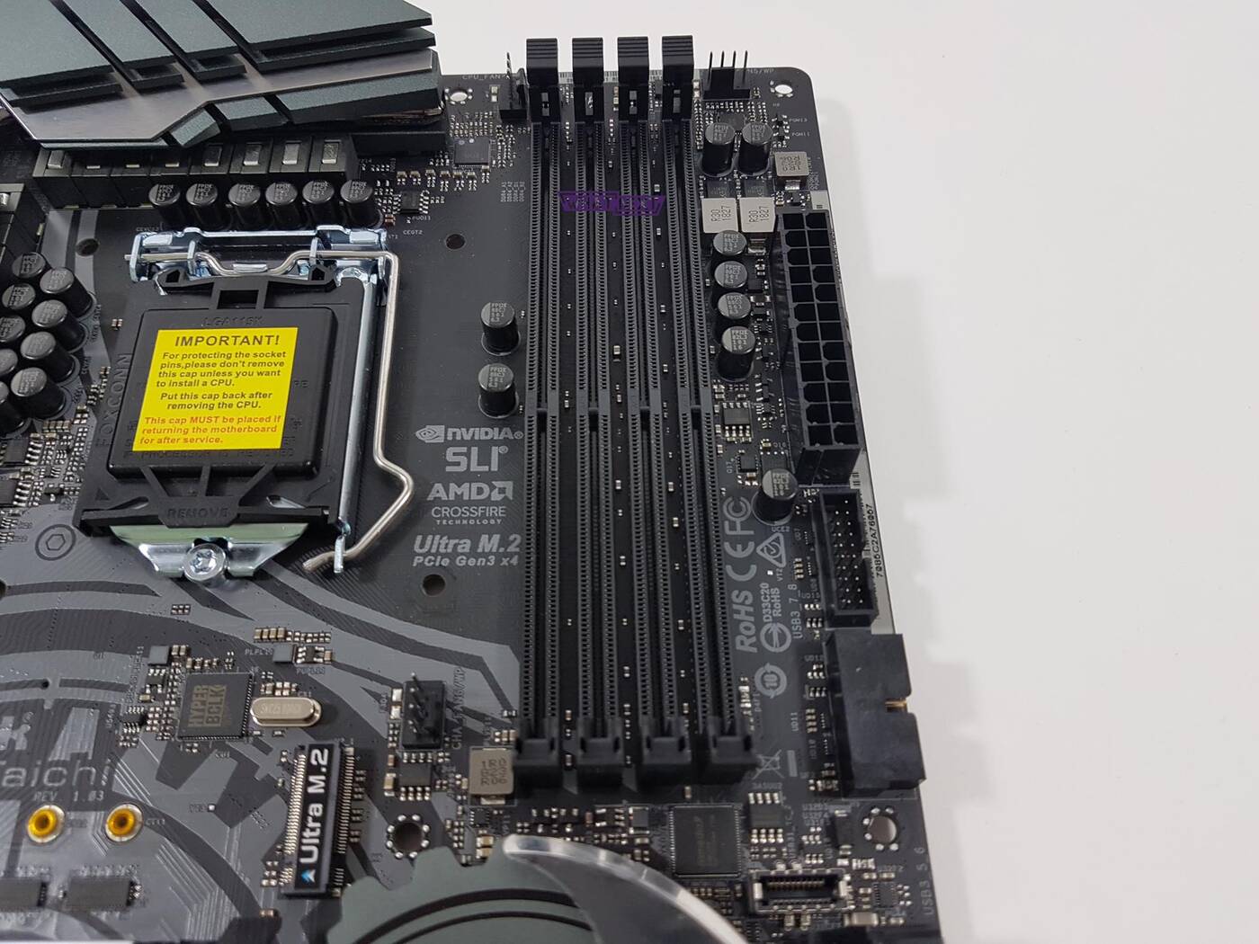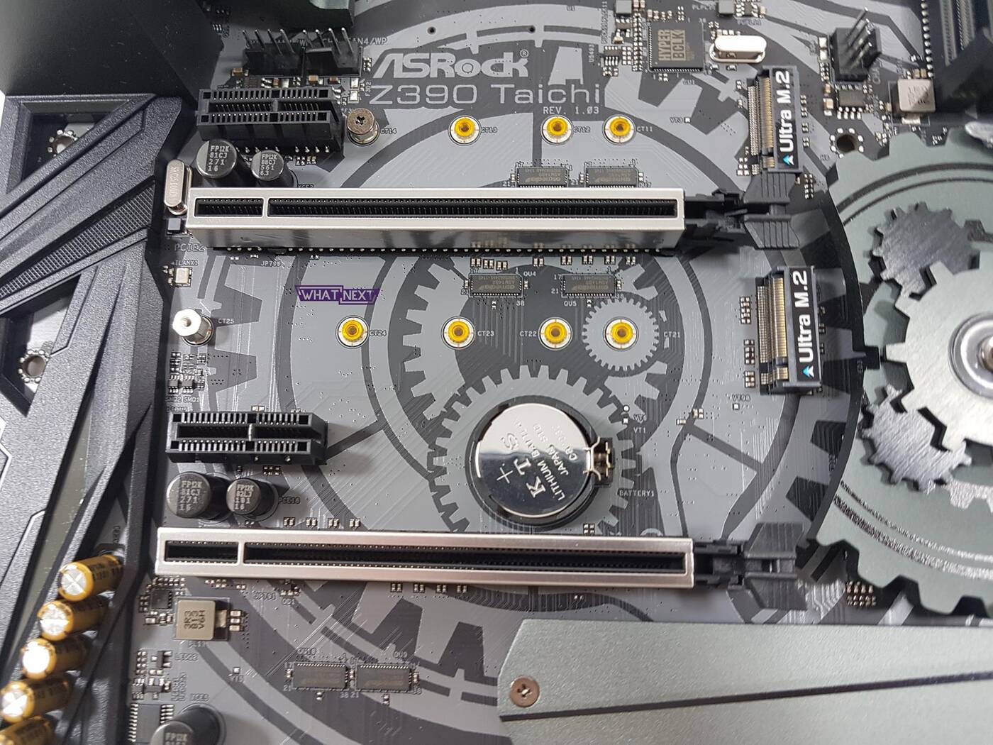 Po prawej stronie od gniazda procesora znajdują się cztery sloty na pamięci DDR4. Płyta poradzi sobie z pamięciami 4200 MHz o pojemności 64 GB. Z390 Taichi obsługuje profile XMP oraz posiada złote złącza poprawiające wydajność pamięci. Produkt ASRock wyposażony został w trzy złącza PCI-E 3.0 x16 oraz dwa PCI-E 3.0 x1. Wszystkie złącza x16 są specjalnie wzmacniane. Płyta nie ma też problemów z obsługą Quad SLI czy Quad CrossFireX. Można więc spokojnie do niej podłączyć kilka grafik.