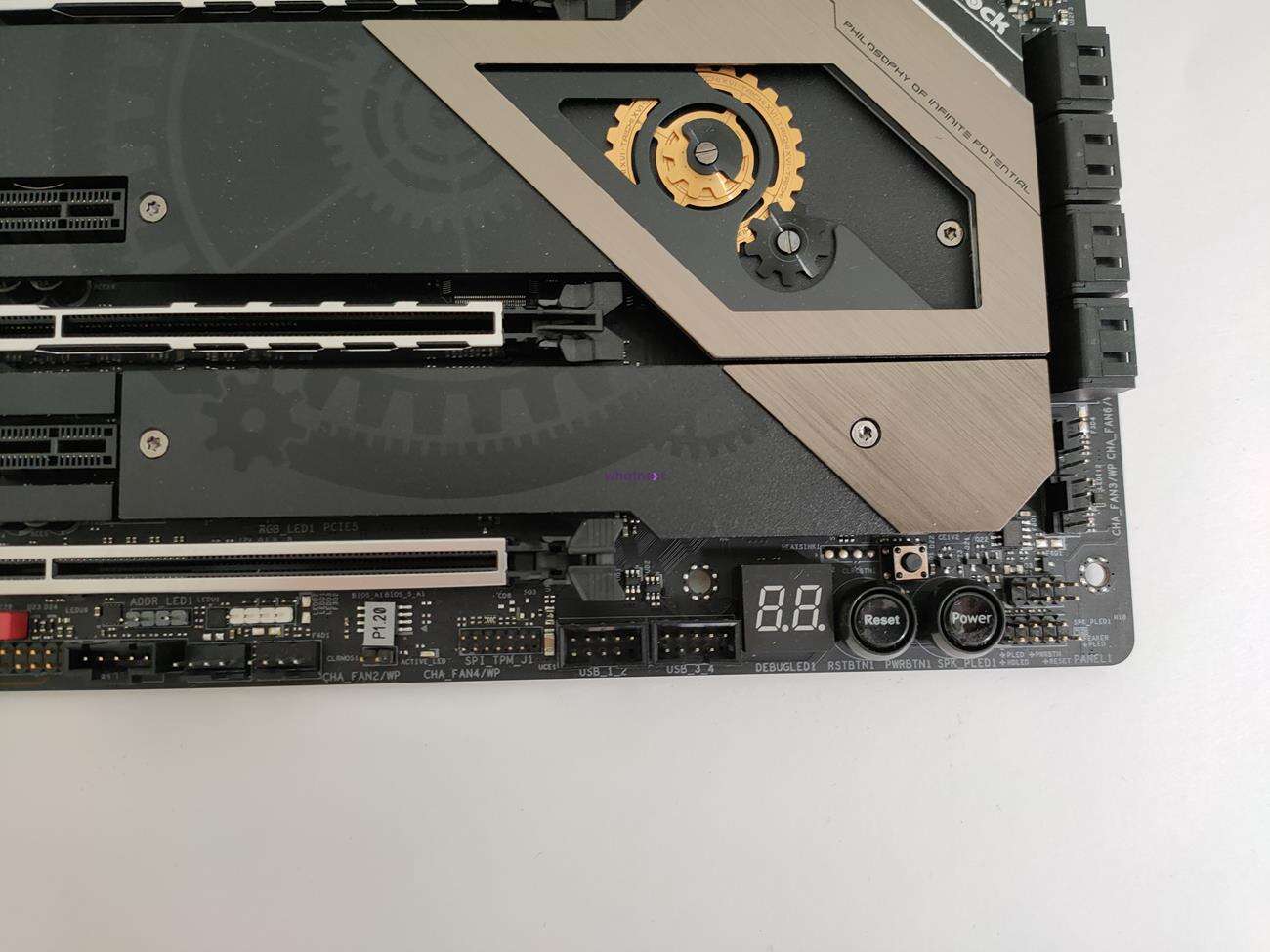 Warto też wspomnieć o samych złączach na PCB. Jest ich naprawdę mnóstwo, więc nie będziecie mieli problemów z montażem sporej ilości wentylatorów czy urządzeń ARGB i RGB. Płyta także ma przyciski startu, restartu oraz wyświetlacz kodów POST.