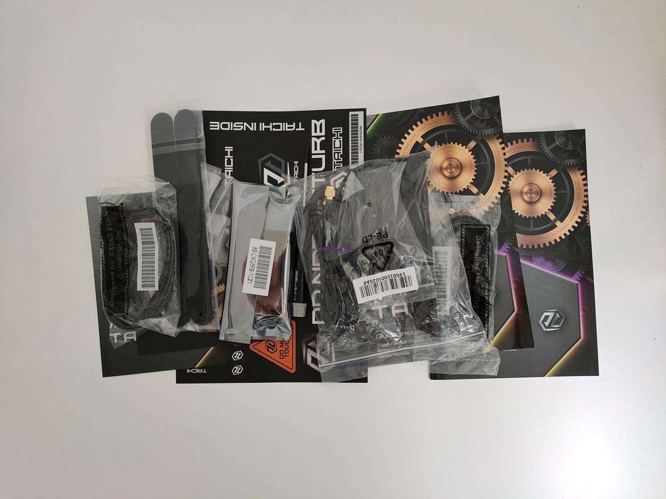 Płytę otrzymujemy wraz ze sporą ilością dodatków. Jest instrukcja, płyta ze sterownikami, cztery kable SATA, mostek SLI, antena WiFi, śrubki czy śrubokręt. Ten ostatni jest potrzebny do demontażu radiatorów na dyski M.2 – mają one nietypowe śrubki. ASRock też jako chyba pierwszy producent w testach dodał mostek SLI, co jest sporym plusem.