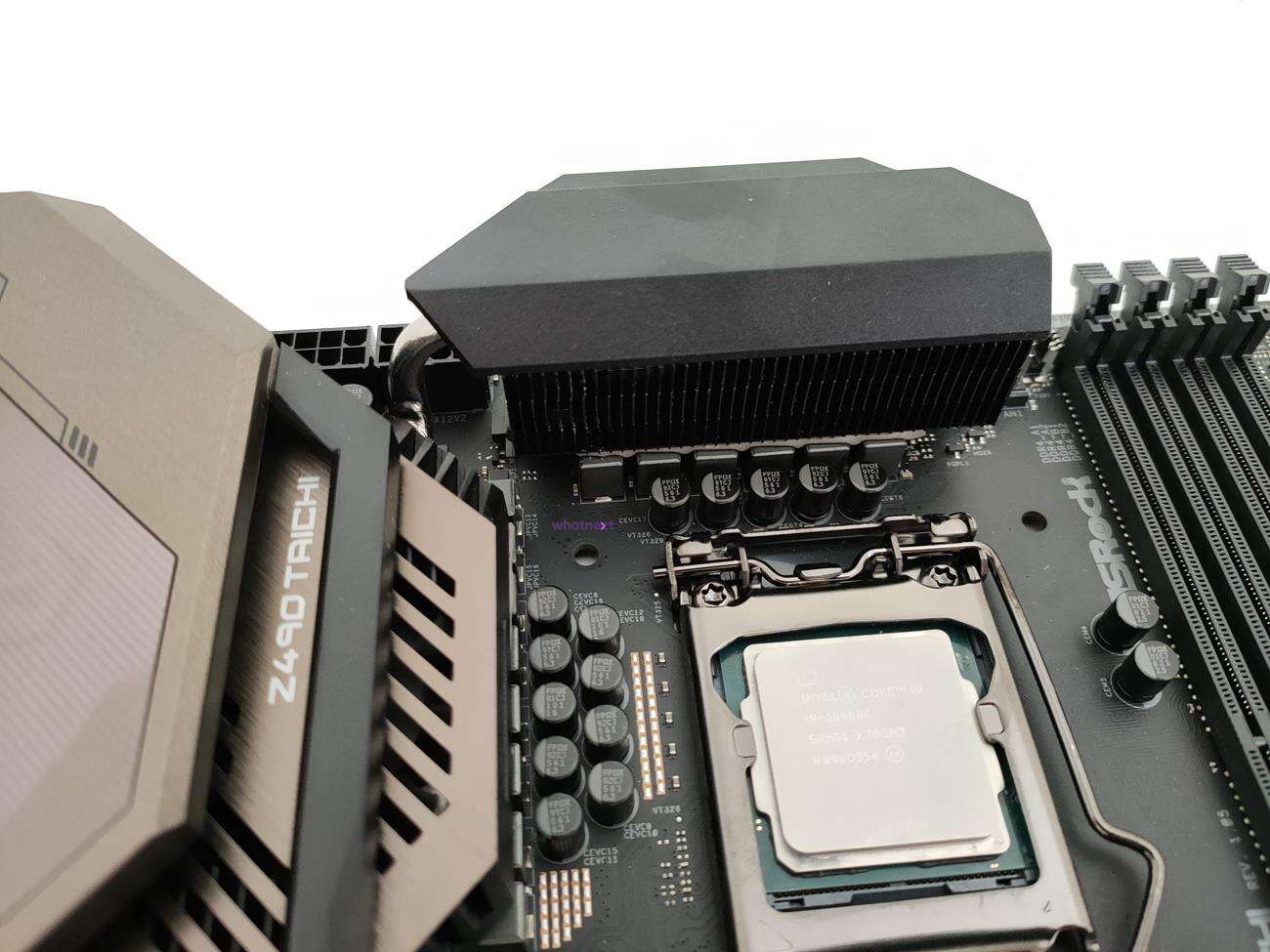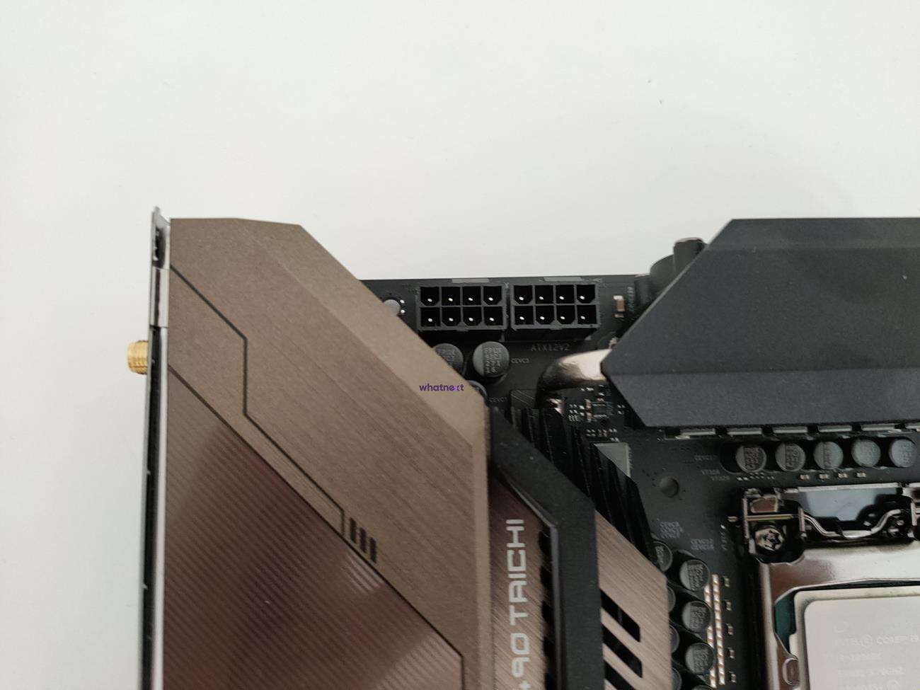 Sekcja zasilania jest 15 fazowa z dławikami 60A. Na wyróżnienie zasługuje jej chłodzenie. Radiatory mają ciepłowód, a z tyłu górnego są dwa wentylatory, które według producenta obniżają temperatury nawet o 15°C. Niestety ma to pewną wadę – górny radiator jest dosyć wysoki, przez co może być problem z chłodzeniami powietrzem. Noctua NH-U14S weszła na styk i minimalnie szersze chłodzenie nie zmieści się w klasycznej orientacji. Procesor zasilany jest z dwóch złączy 8 pin – warto zadbać o odpowiedni zasilacz.