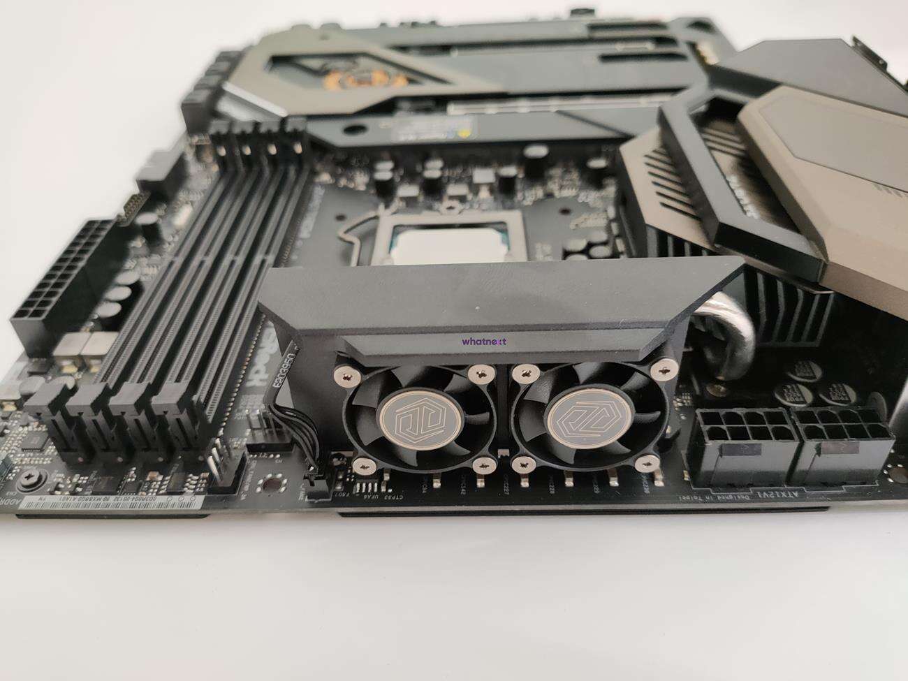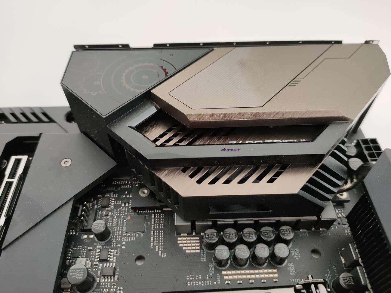 Sekcja zasilania ma dwa wentylatory, które jednak nie powinny przeszkadzać podczas działania. Pod obciążeniem każde AiO będzie głośniejsze od nich, więc tutaj nie widzę problemu. Jedyny minus tego rozwiązania to wysokość radiatora – do tej płyty najlepiej jest kupić AiO zamiast rozbudowanego chłodzenia powietrzem. Sama sekcja dzięki wentylator jest zima, a 15 faz zapewni odpowiednie zasilanie dla każdego procesora.
