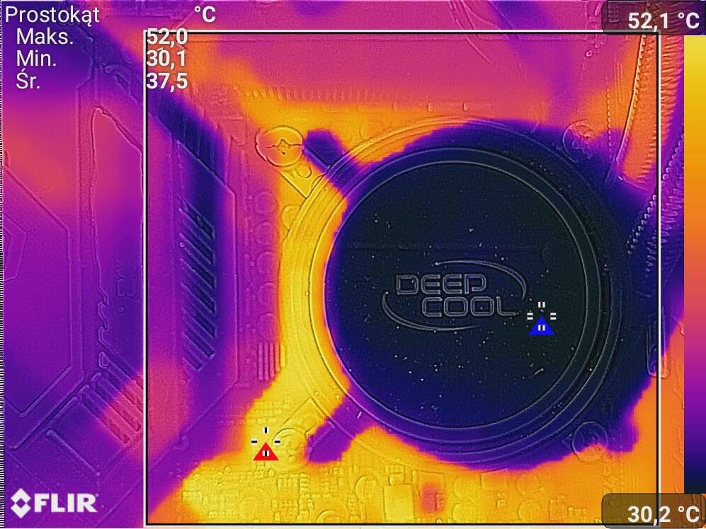 W testach temperatury wykorzystałem moduł termowizyjny smartfonu CAT S61. Obciążenia dokonałem za pomocą programu OCCT, test Linpack, który trwał 5 minut. Spoczynek polegał na włączeniu komputera i pozostawieniu go na 5 minut bez ruszania.