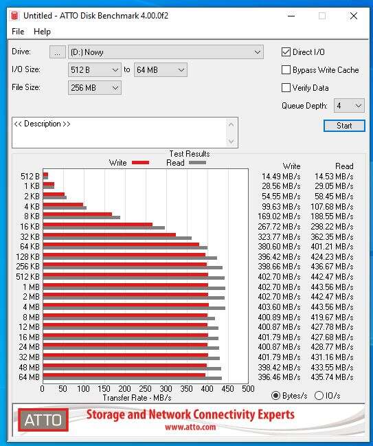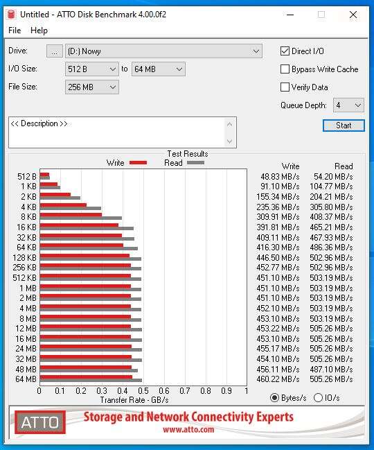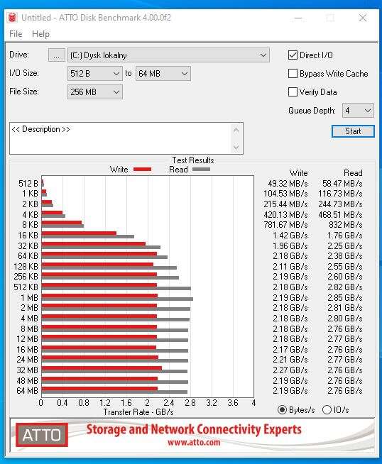 Wyniki wszystkich złączy są bez zarzutów – wyciągają maksimum z podłączonego dysku. M.2 PCI-E przy zapełnieniu 90% nagrzewał się do 86°C w teście Atto. Wynik jest wysoki, ale jak sami widzicie nie ma mowy o throttlingu – radiator sprawdza się w praktyce.