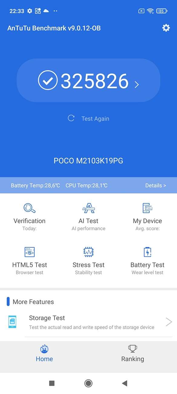 W Antutu Benchmark 9.0.12 smartfon osiągnął  325 826 pkt. Niestety testy w 3D Mark nie mogły się odbyć, gdyż program uparcie nie chciał pobrać zawartości do testów, mimo łączenia z różnymi sieciami. Być może to wina programu albo mojego egzemplarza testowego. Nie wiem.