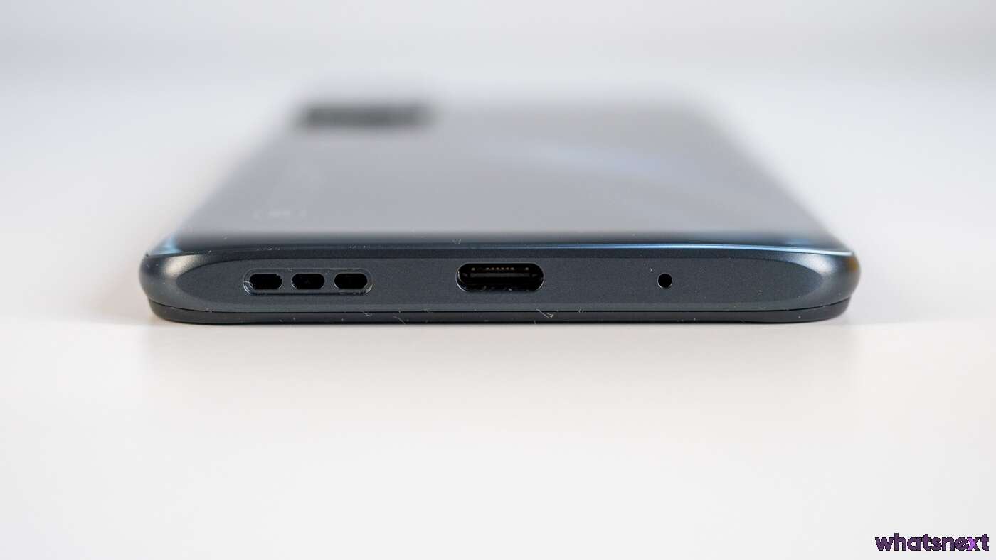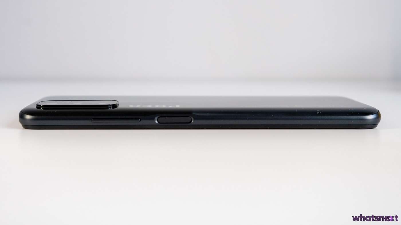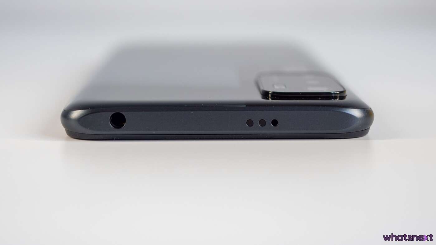 Jeśli chodzi o rozłożenie przycisków to u dołu obudowy znajdziemy port USB C i głośnik monofoniczny. Właśnie – monofoniczny. POCO M3 był tańszy, a miał głośniki stereo… U góry umieszczono port podczerwieni oraz złączem miniJack. Po lewej stronie mamy tackę na karty, natomiast przycisk służący do włączania telefonu oraz przyciski regulacji głośności umieszczono po stronie prawej.
