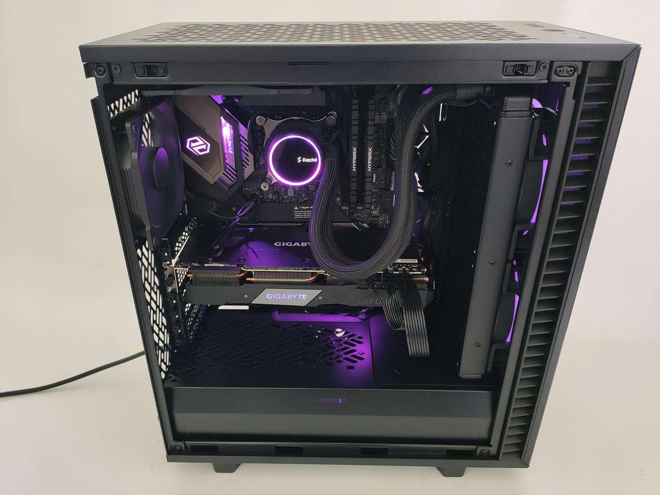 Miałem jedynie mały problem z chłodnicą. Zdecydowałem się na jej montaż taki, jak na zdjęciu powyżej. Mało widać tutaj ARGB wentylatorów, ale powinno to zapewniać najniższe temperatury. Możecie oczywiście przy takim montażu zainstalować wentylatory w trybie pull lub całkowicie odwrócić obieg powietrza – opcji montażowych jest naprawdę sporo. Możecie też kupić AiO w wersji Dynamic – nie będzie tutaj podświetlenia wentylatorów. Trochę dziwnie wyglądają też węże, ale ma to związek z napisem Fractal Design na pompce – żeby nie był on do góry nogami to musi być tak zamontowany. Chłodnica weszła jednak bez problemów na przód.