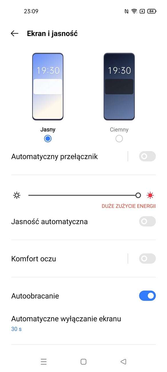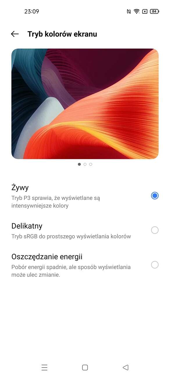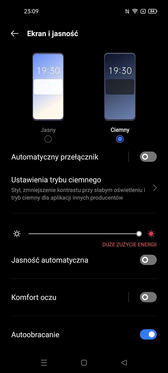 W ustawieniach znajdziemy możliwość włączenia filtra światła niebieskiego, trybu ciemnego dla menu oraz zdecydować o poziomie nasycenia barw.
