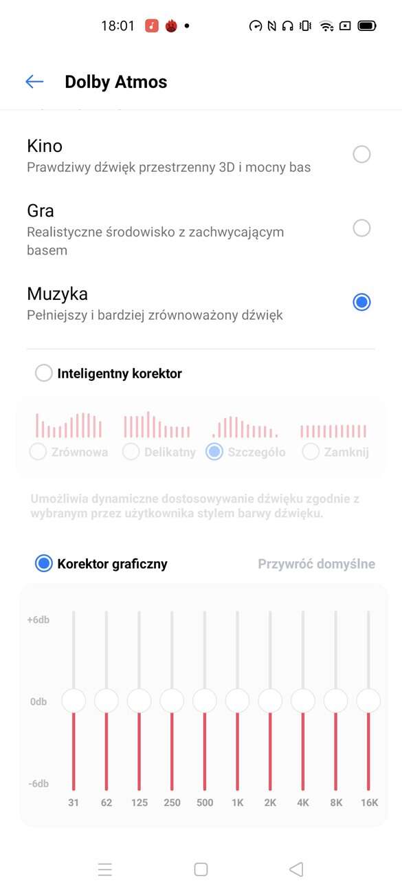 Smartfon wspiera Dolby Atmos, ale to już kolejny smartfon, w którym rekomenduję jego wyłączenie. Wtedy dźwięk po prostu brzmi lepiej i nie jest pozbawiony basów. Niestety nawet wtedy jest co najwyżej przyzwoicie. Bas po podłączeniu słuchawek pod gniazdo USB C jest płaski i mało imponujący, z kolei wysokie tony potrafią być piskliwe.