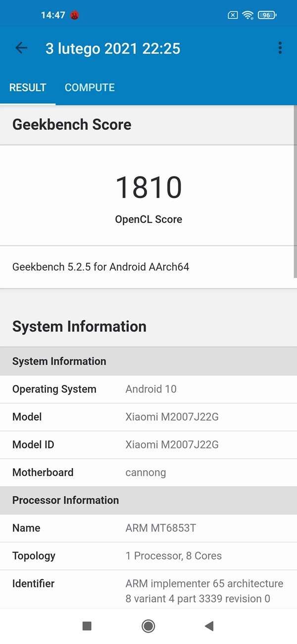 - Geekbench 5 (Compute) – 1810 pkt (OpenCL)