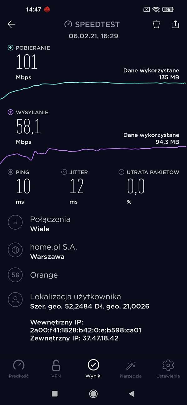 Oczywiście największą zaletą smartfona jest jednak obsługa 5G, które powinno działać w każdej sieci. Prędkość 5G w Warszawie w sieci Orange, zmierzona programem Speedtest jest dobra, ale nie powalająca. 101 Mb/s pobieranie i 58.1 Mb/s – wysyłanie danych.
