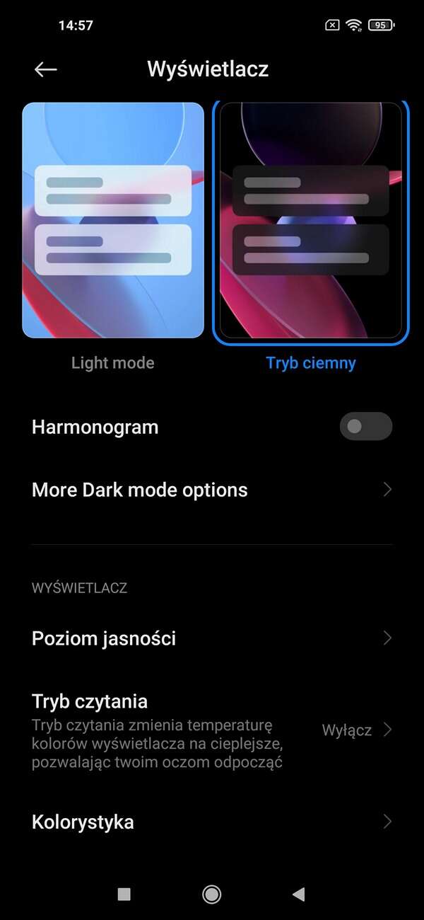 W ustawieniach znajdziemy filtr światła niebieskiego, tryb ciemny dla menu oraz możliwość regulacji nasycenia kolorów i temperatury barwowej.