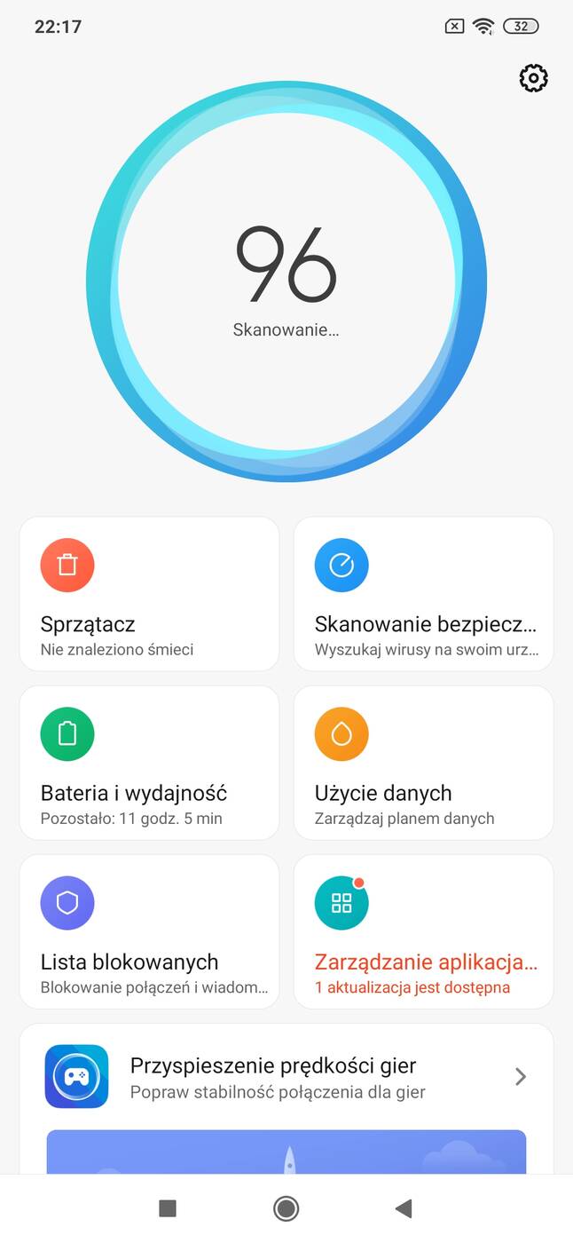 Telefon w polskiej dystrybucji został wyposażony w Androida 9 wraz z nakładką producenta – MIUI Global 11 (po aktualizacji). Nakładka jest czytelna, przejrzysta i działa bardzo płynnie, o czym pisałem już przed chwilą. Na pokładzie znajdziemy dyktafon, skaner kodów QR, funkcję nagrywania ekranu oraz Pilot Mi, pozwalający zamienić smartfon w pilot do TV, dzięki portowi podczerwieni. Ponadto nie zabrakło autorskich aplikacji do czyszczenia urządzenia i odtwarzania multimediów oraz przeinstalowanego Facebooka czy Netflixa. Jest obsługa motywów, gestów ekranowych oraz uwaga – czyszczenie głośnika przy pomocy specjalnie przygotowanego dźwięku. Jego skuteczność jest jednak wątpliwa. Zauważyłem, że radzi sobie tylko z lekkim kurzem. Bardziej przydatna na co dzień jest funkcja wybudzenia ekranu dwu klikiem oraz możliwość monitorowania prędkości przesyłu danych.