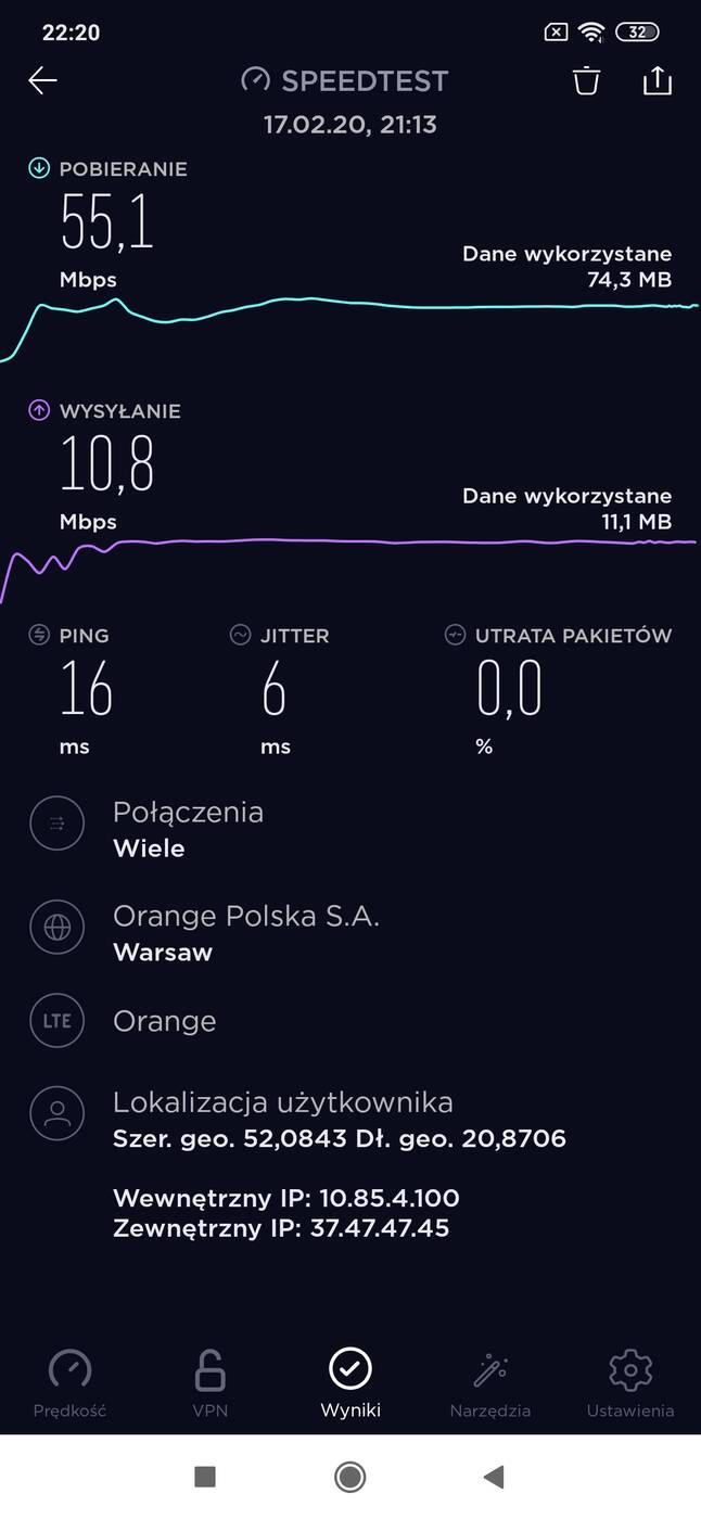 Smartfon jest pełnym Dual-SIMem, oczywiście z obsługą LTE kat.12. Wyniki w testach w programie Speedtest w sieci Orange pod Warszawą przedstawiają się następująco: 55,1 Mb/s pobieranie i 10,8 Mb/s w przypadku wysyłania danych. Nie jest źle, ale mogłoby być zdecydowanie lepiej. Na pociechę telefon obsługuje Wi-Fi w paśmie zarówno 2,4 GHz, jak i 5 GHz.