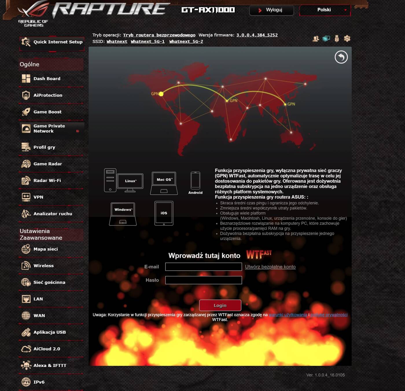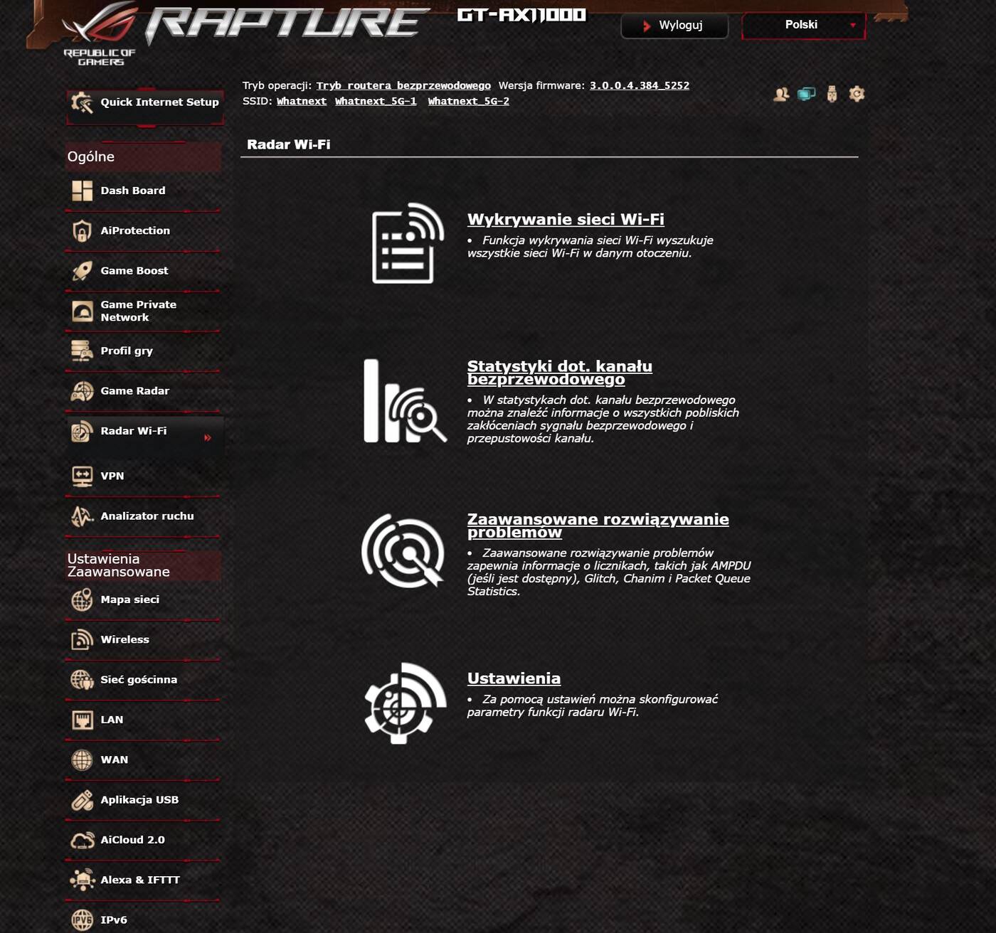 Asus ROG Rapture GT-AX11000 obsługuje sieci od 802.11a do 802.11ax przy częstotliwości 2,4 GHz i 5 GHz. ten ostatni to najnowszy standard WiFi, który daje jeszcze większe możliwości. Transfery mogą wynosić do 1148 Mbps przy 2,4 GHz oraz do 4804 Mbps przy 5 GHz. Warto tutaj wspomnieć, że router oferuje jedną sieć 2,4 GHz oraz dwie 5 GHz – sami widzicie, jakie są możliwości podłączenia urządzeń.