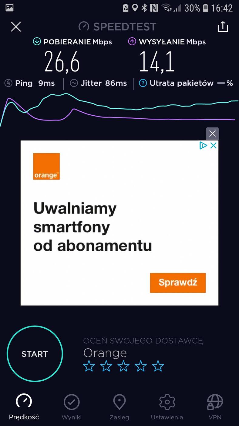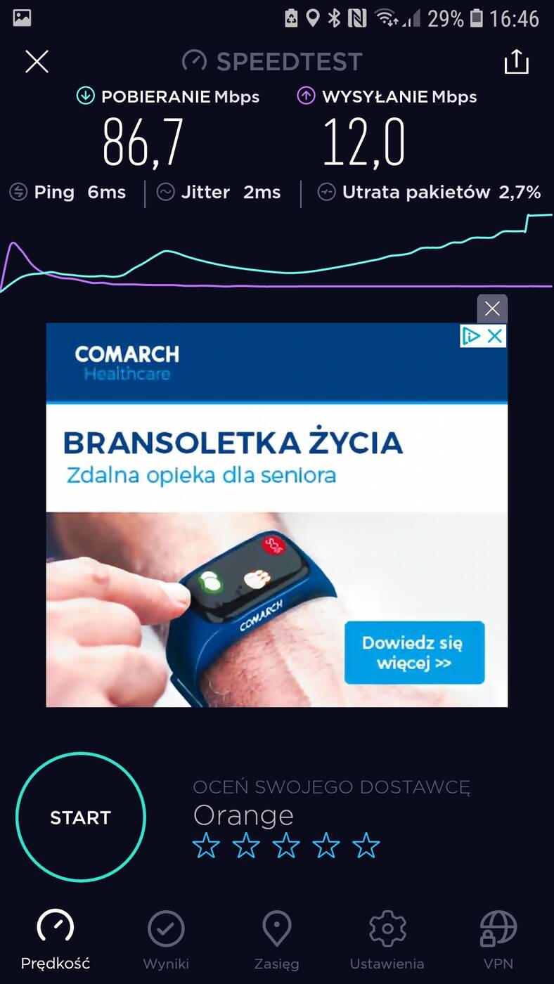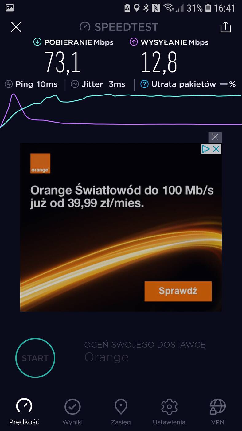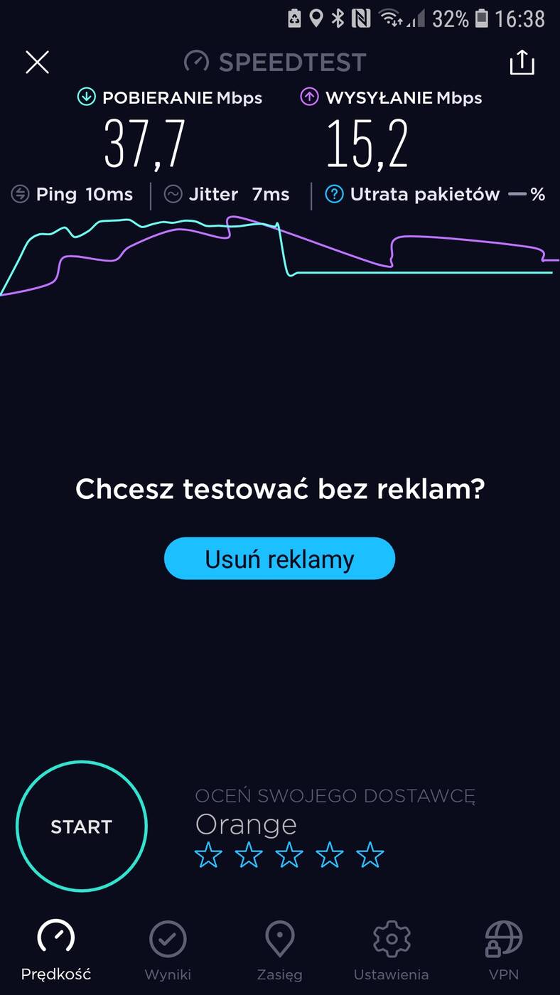 Aktualnie mieszkam w bloku, na 4 piętrze. Router stoi przy drzwiach wejściowych, a pokój z komputerem oddalony jest o ok. 10 m. Przy standardowym routerze od Orange przy sieci 2,4 GHz nie ma możliwości osiągnięcia maksimum łącza (100 Mb/s pobieranie) w pokoju – zazwyczaj jest ok. 30 Mb/s. Dopiero przy 5GHz osiągnięte jest maksimum. Testy przeprowadziłem przy wykorzystaniu Samsunga Galaxy S7.