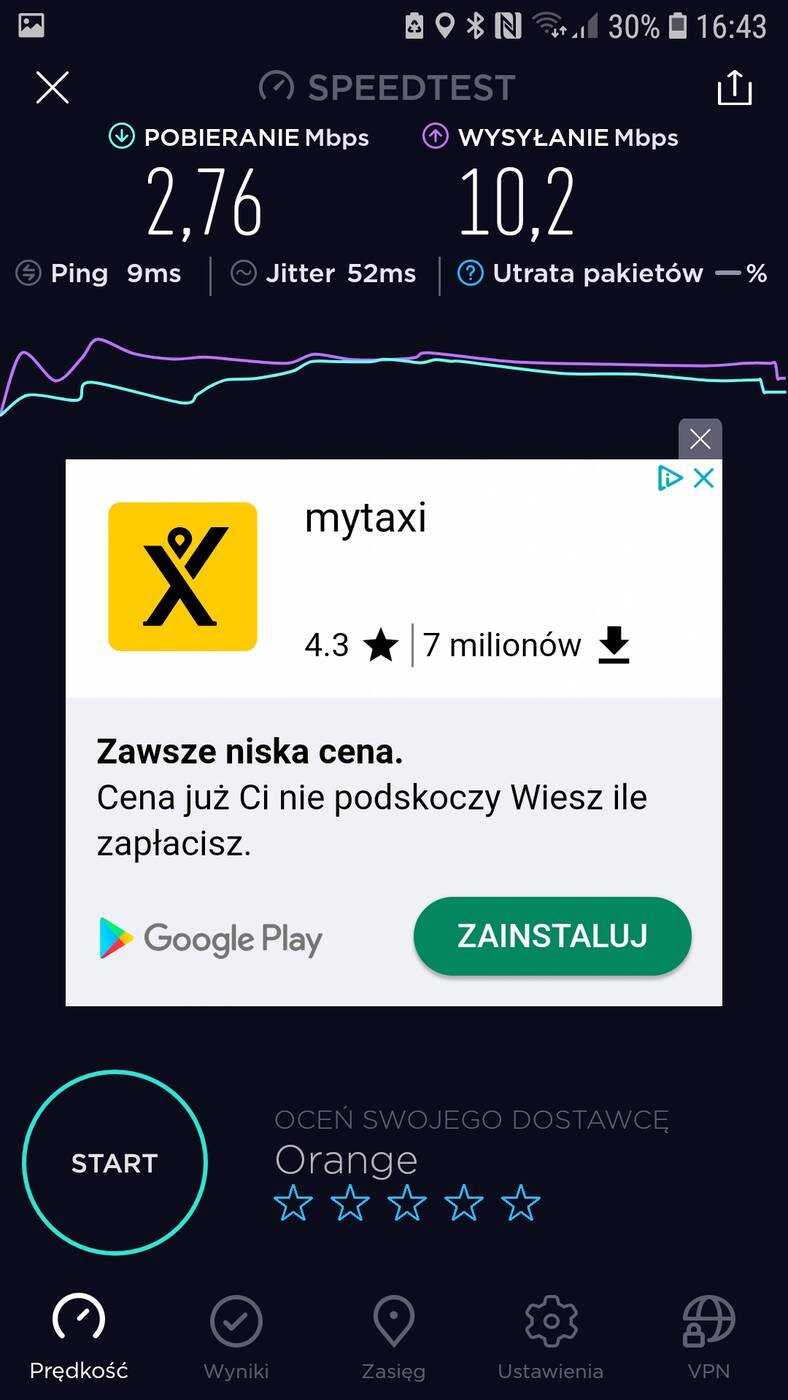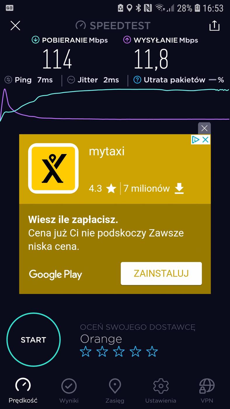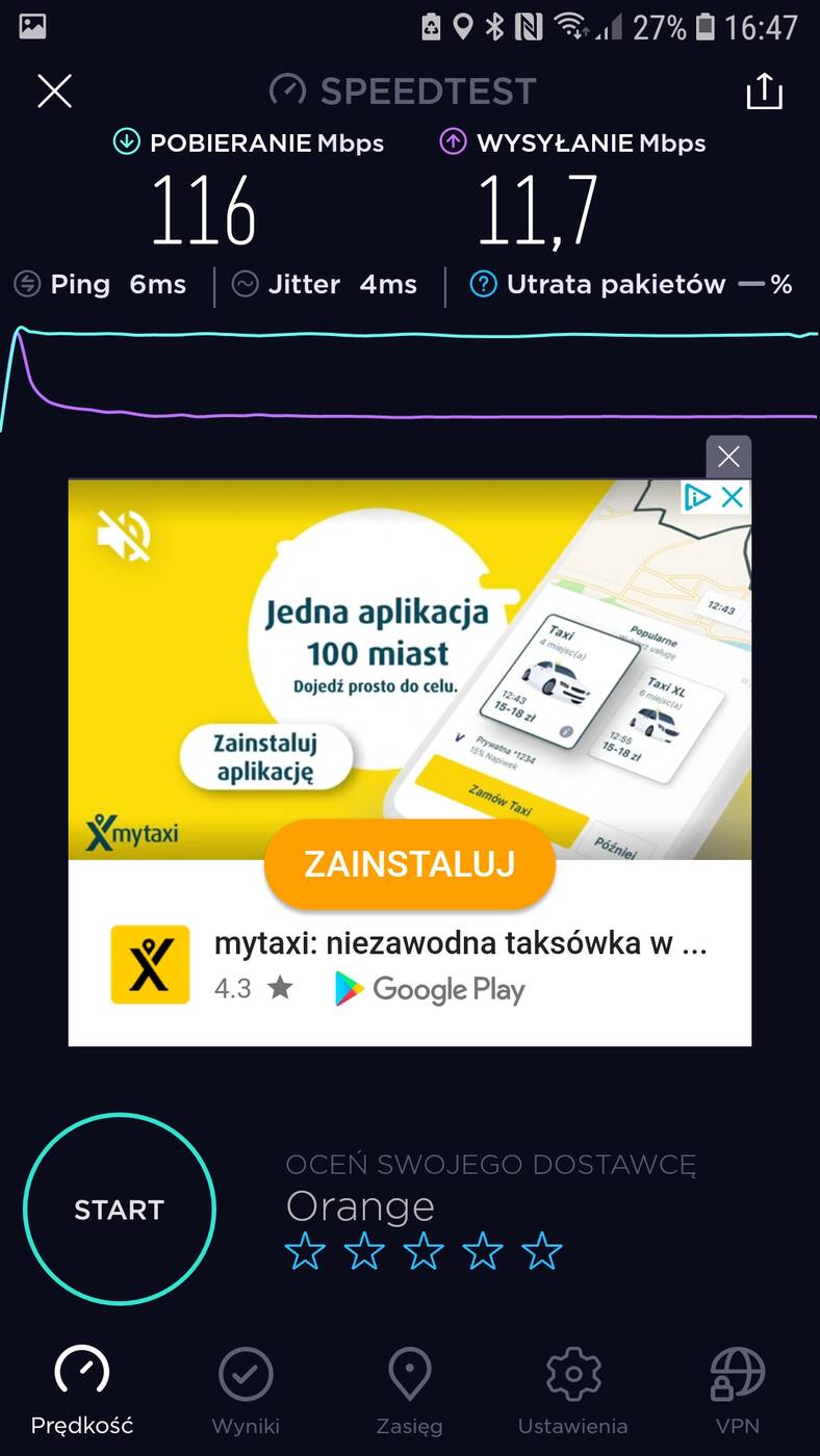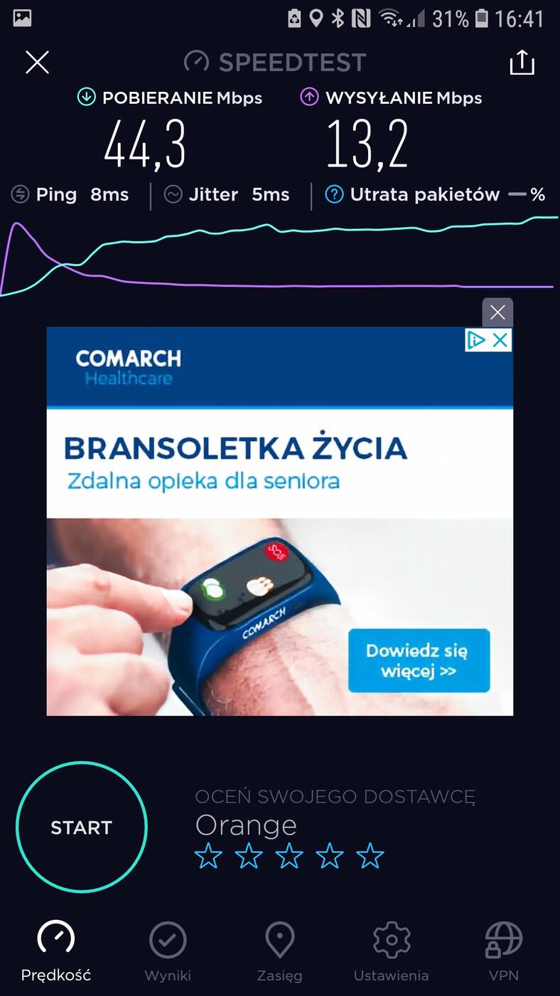 Aktualnie mieszkam w bloku, na 4 piętrze. Router stoi przy drzwiach wejściowych, a pokój z komputerem oddalony jest o ok. 10 m. Przy standardowym routerze od Orange przy sieci 2,4 GHz nie ma możliwości osiągnięcia maksimum łącza (100 Mb/s pobieranie) w pokoju – zazwyczaj jest ok. 30 Mb/s. Dopiero przy 5GHz osiągnięte jest maksimum. Testy przeprowadziłem przy wykorzystaniu Samsunga Galaxy S7.