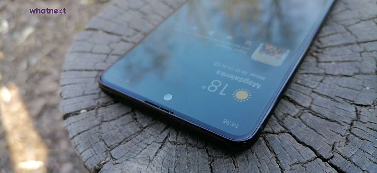 Telefon został wyposażony w 6,7 calowy wyświetlacz wykonany w technologii Super AMOLED o proporcjach 20/9 i rozdzielczości 2400 x 1080. Jest więc tylko o 0,1 cala mniejszy niż w Note 10+. Z uwagi na brak zakrzywionych krawędzi, optycznie wydaje się nawet od niego większy. Podobnie jak w droższych modelach, również tutaj mamy okrągłą dziurkę w ekranie na przednią kamerę. Wbrew pozorom, wygląda to całkiem nieźle.