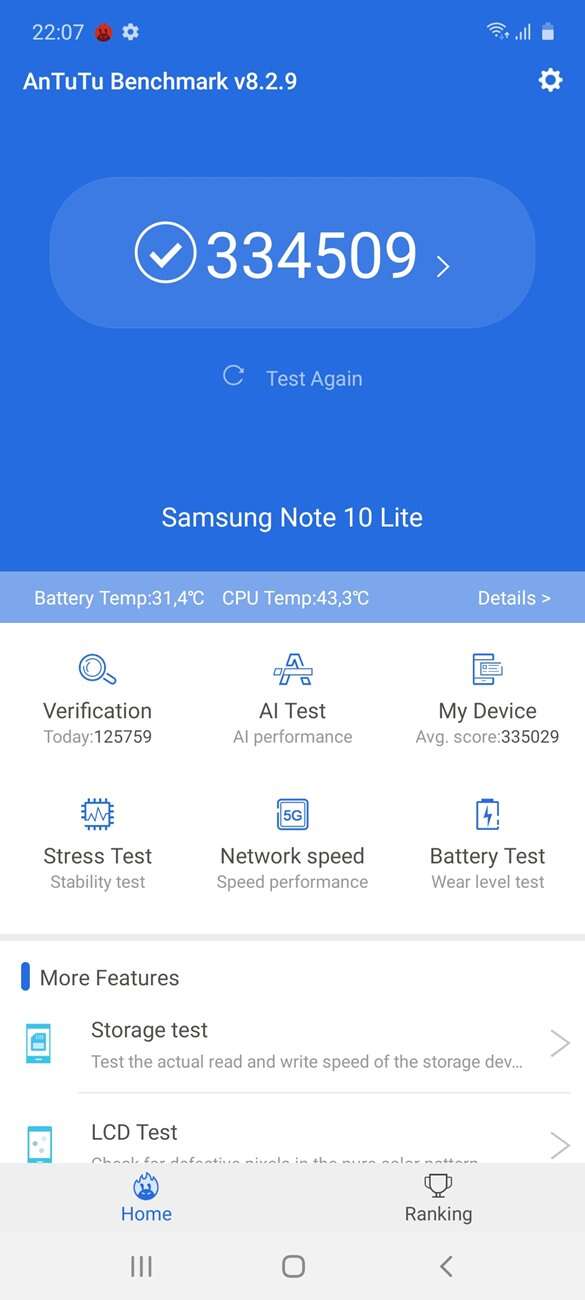 - Antutu Benchmark 8.2.9 – 334 509 pkt