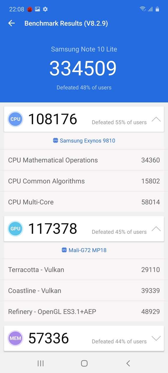 Kupując Galaxy Note 10 Lite możemy liczyć na ośmiordzeniowy procesor Samsung Exynos 9810 wsparty grafiką Mali-G72 MP18 i 6 GB pamięci RAM. Brzmi znajomo? Zgadza się – to dokładnie ten zestaw który napędzał Note 9 w 2018 roku. Dostajemy więc blisko dwuletnie podzespoły, ale nie ma powodów do obaw – nadal są one bardzo wydajne. Oczywiście nie aż tak jak najnowsze konstrukcje albo chociażby Galaxy S10 Lite, ale jednak: