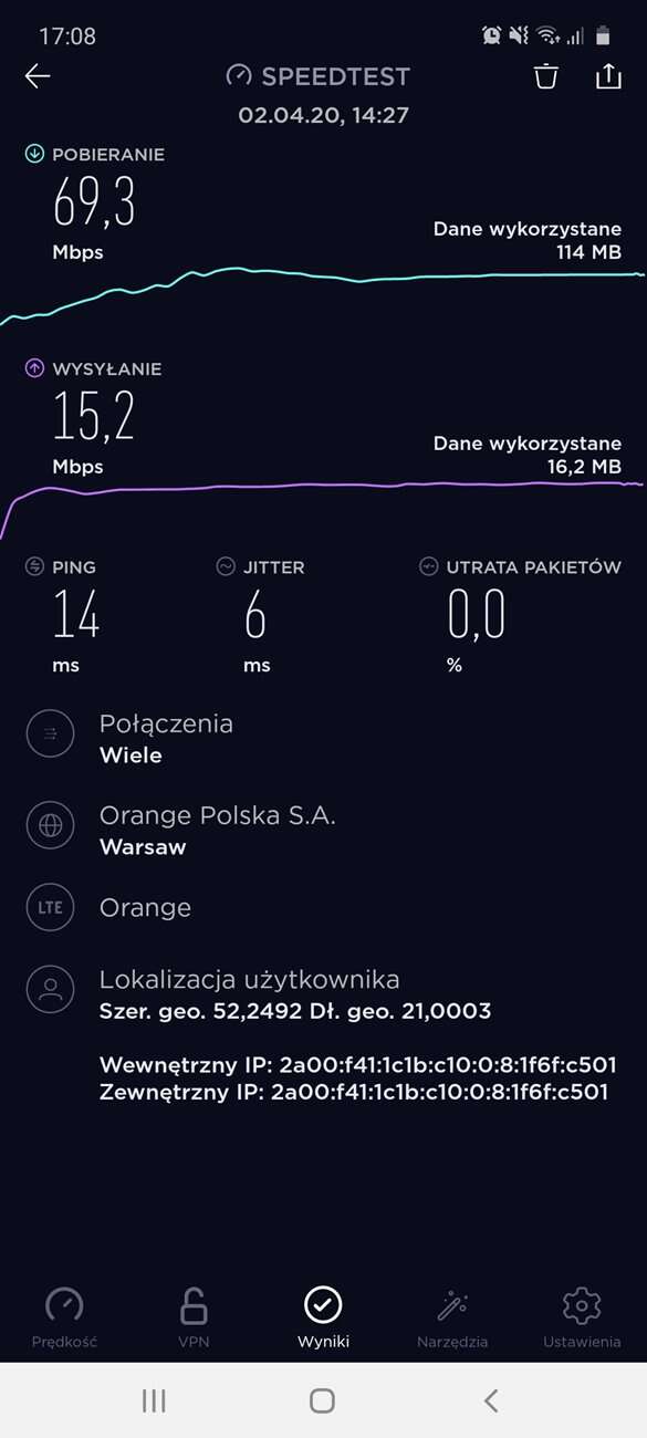 Prędkość LTE w programie Speedtest w sieci Orange pod Warszawąwygląda następująco: 69,3 Mb/s pobieranie i 15,2 Mb/s w przypadku wysyłania danych – wyniki bardzo podobne do Galaxy A51. Połączenie przez Wi-Fi było stabilne przez cały okres trwania testów, zarówno w paśmie 2,4 GHz, jak i 5 GHz. Nie mam uwag.
